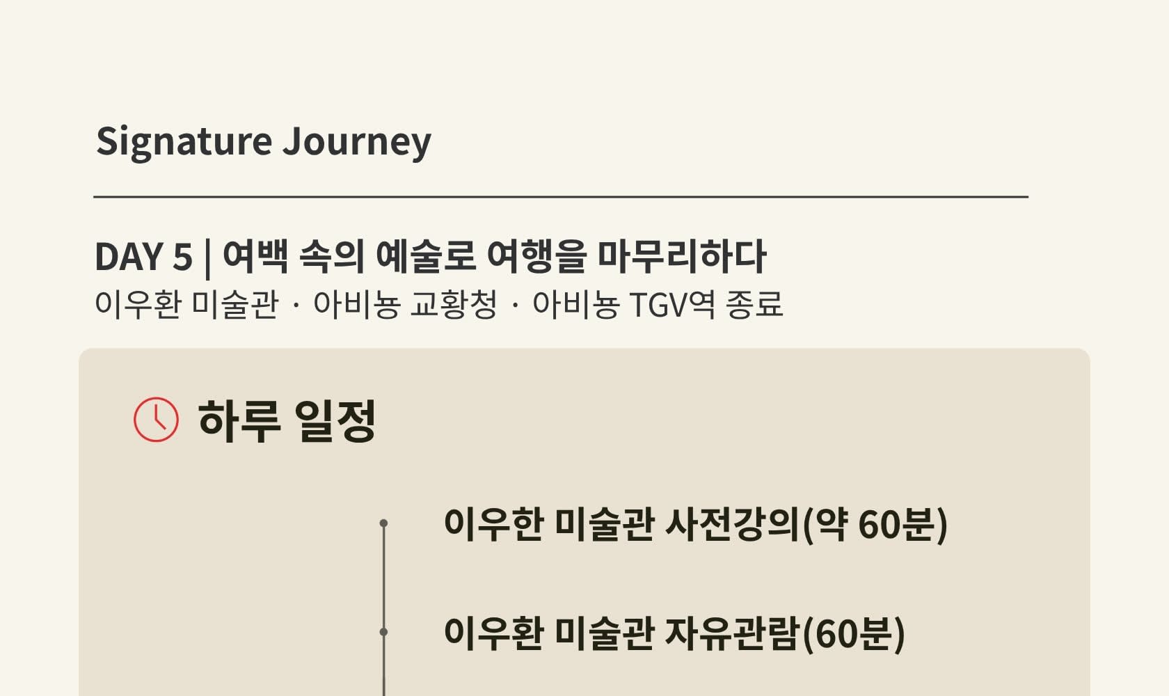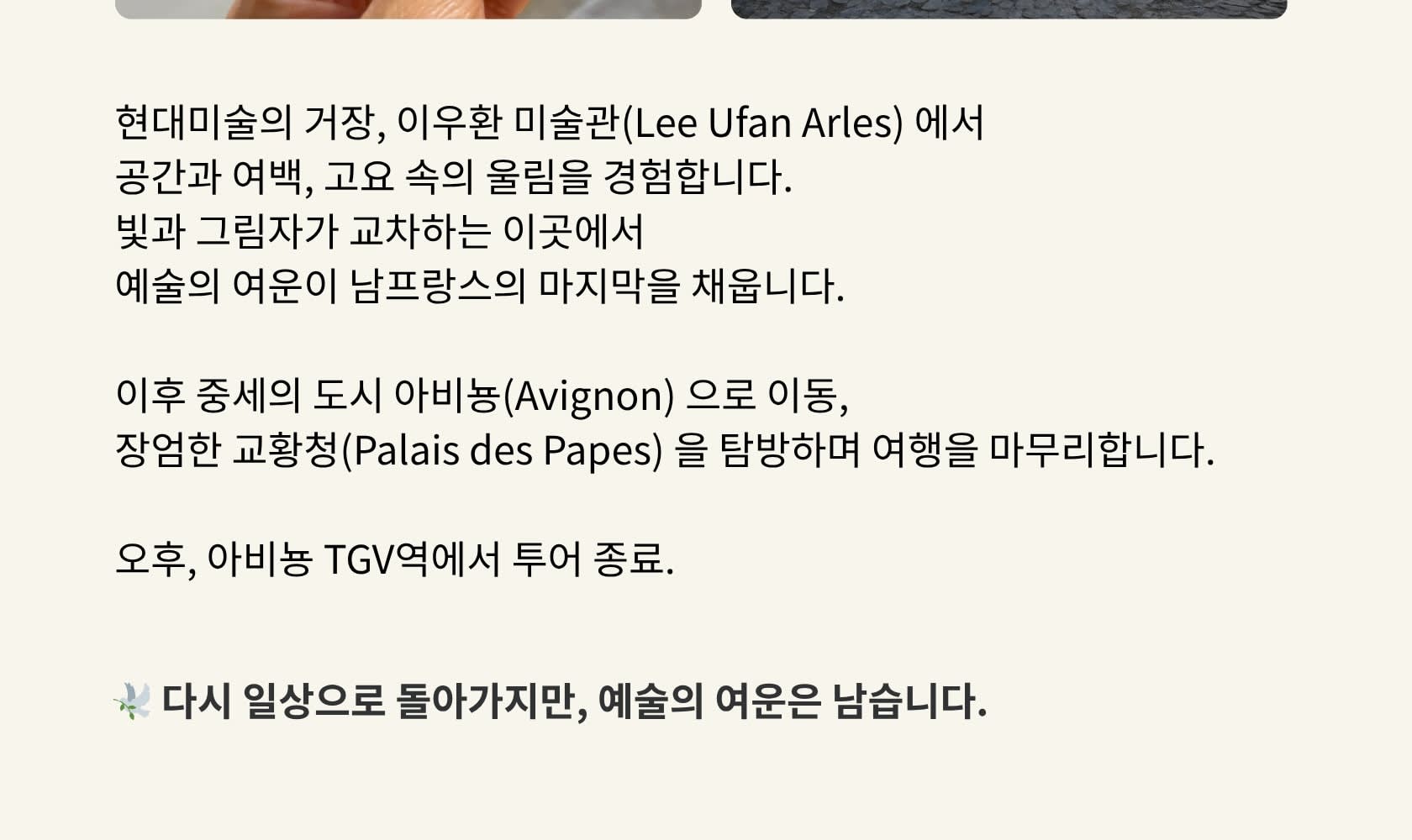 📍 이우환 미술관 사전 설명 & 자유관람 (약 2시간) 📍 아비뇽 이동 및 점심 자유식 (약 3시간) 📍 아비뇽 교황청 자유관람 🚌 투어 종료