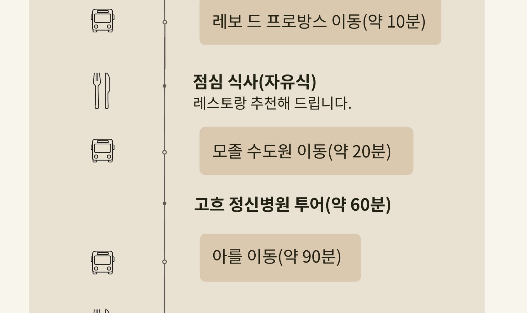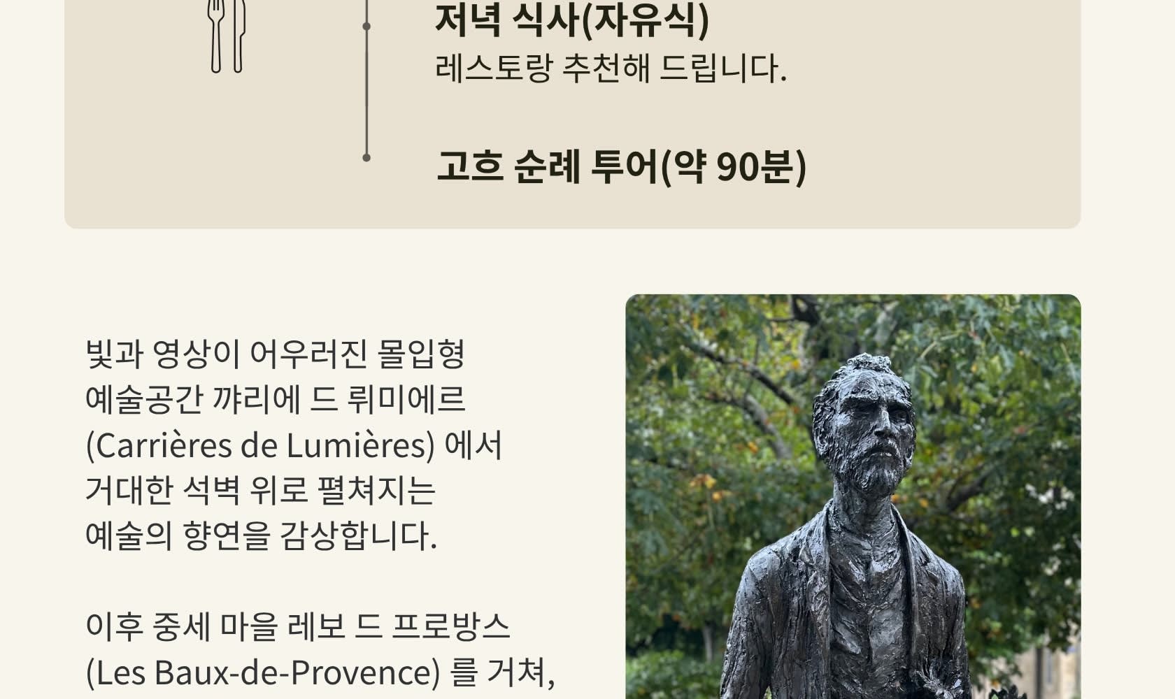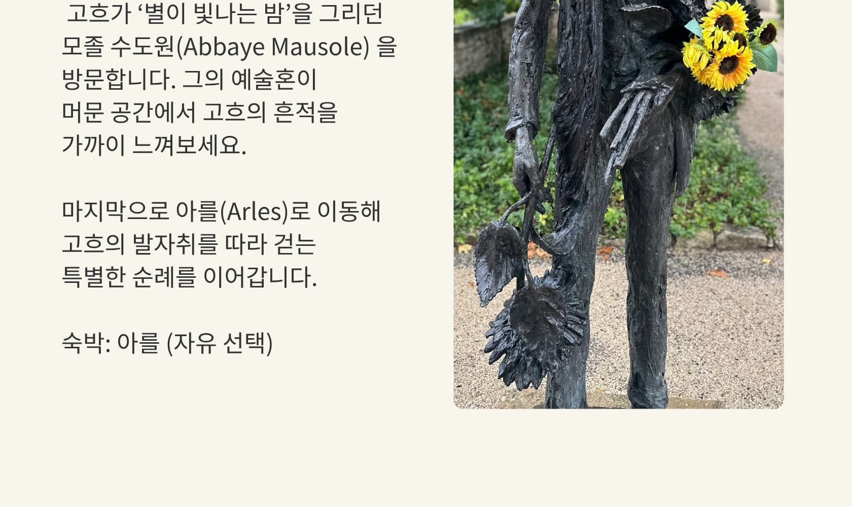📍 까리에르 드 뤼미에르 ‘빛의 채석장’ 관람 (약 1시간 10분) 📍 점심 자유식 (약 1시간 30분) 📍 생폴 드 모졸 수도원 (고흐 정신병원) 관람 (약 1시간 20분) 📍 아를 저녁 & 고흐 순례 투어 (약 4시간 30분) 🚌 Day 4 종료