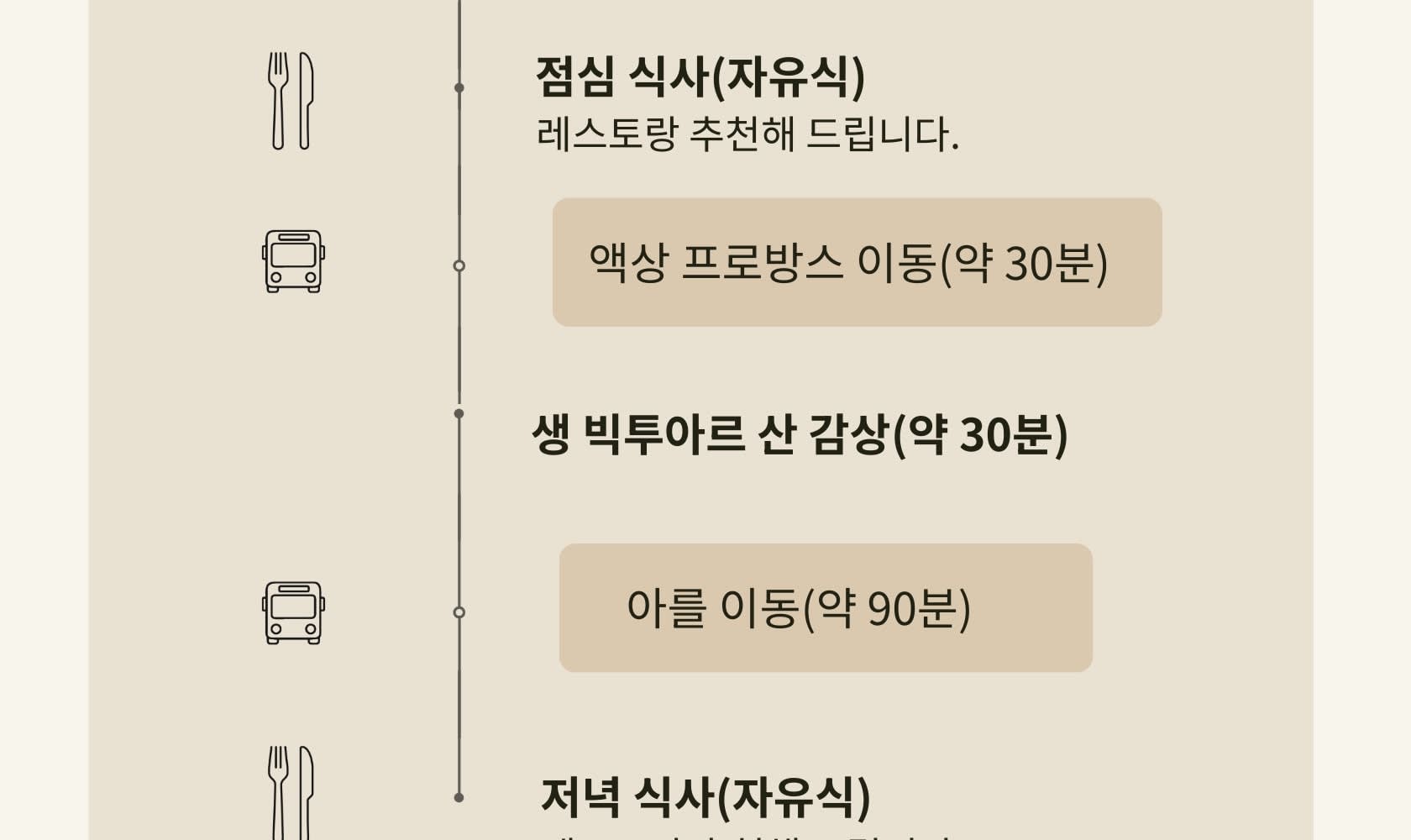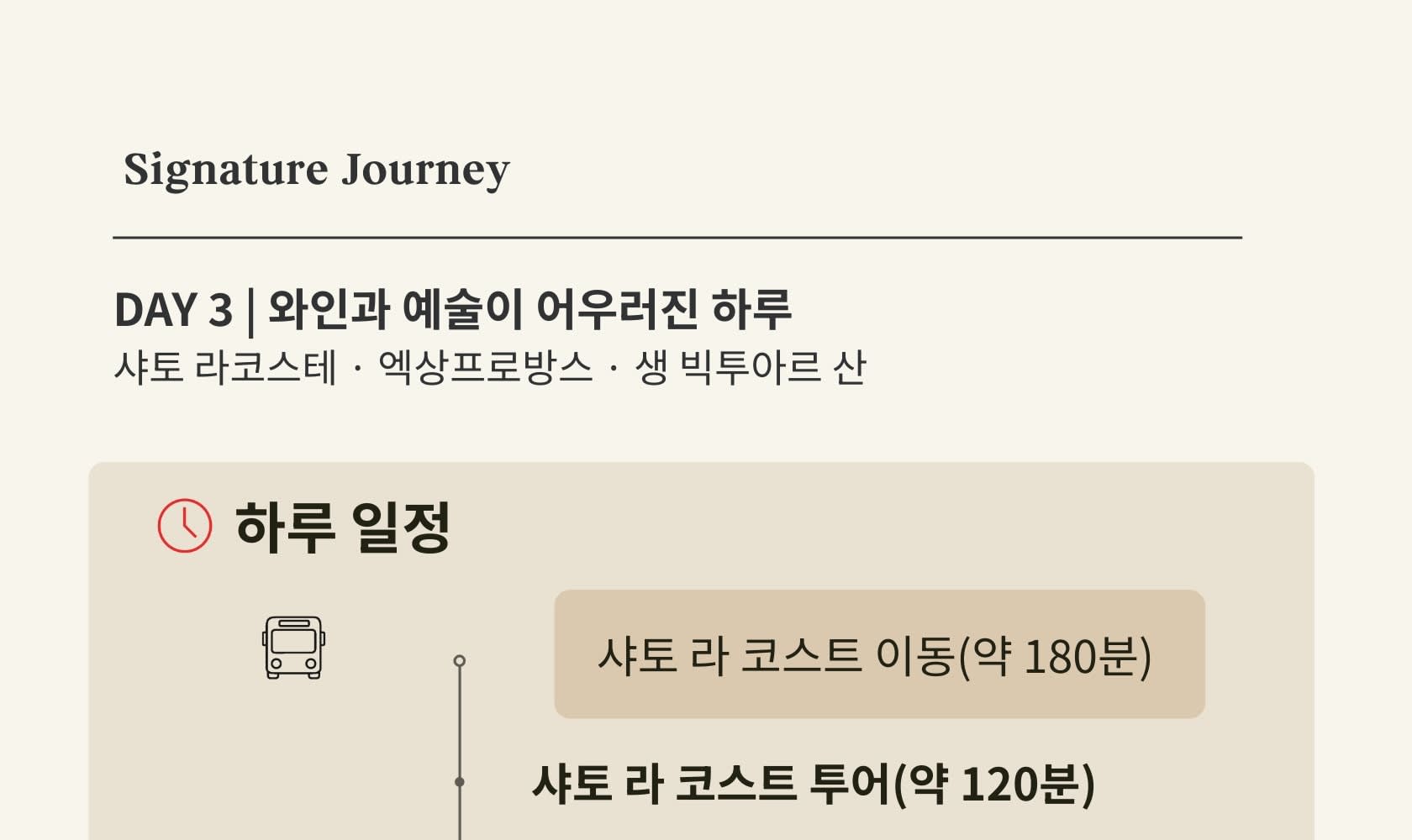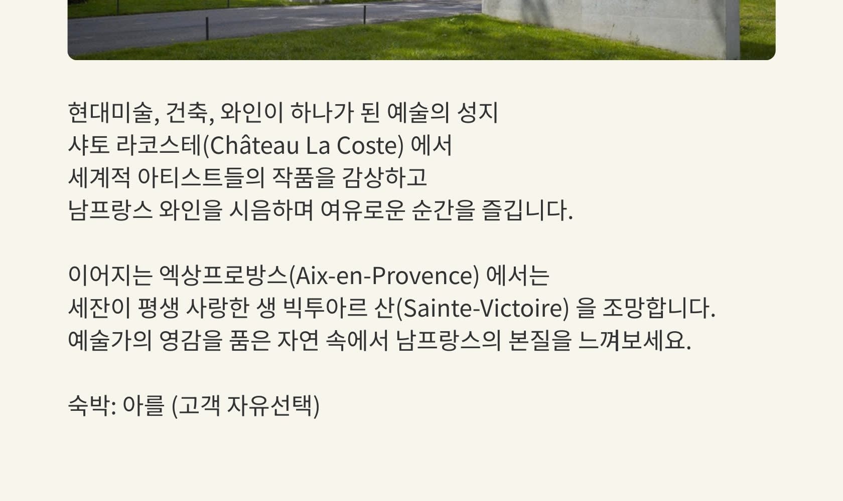 📍 샤토 라 코스트 이동 & 투어 + 점심 (약 5시간 30분) 📍 엑상 프로방스 이동 → 생 빅투아르 산 감상 (약 30분) 📍 아를 이동 및 저녁 자유식 🚌 Day 3 종료