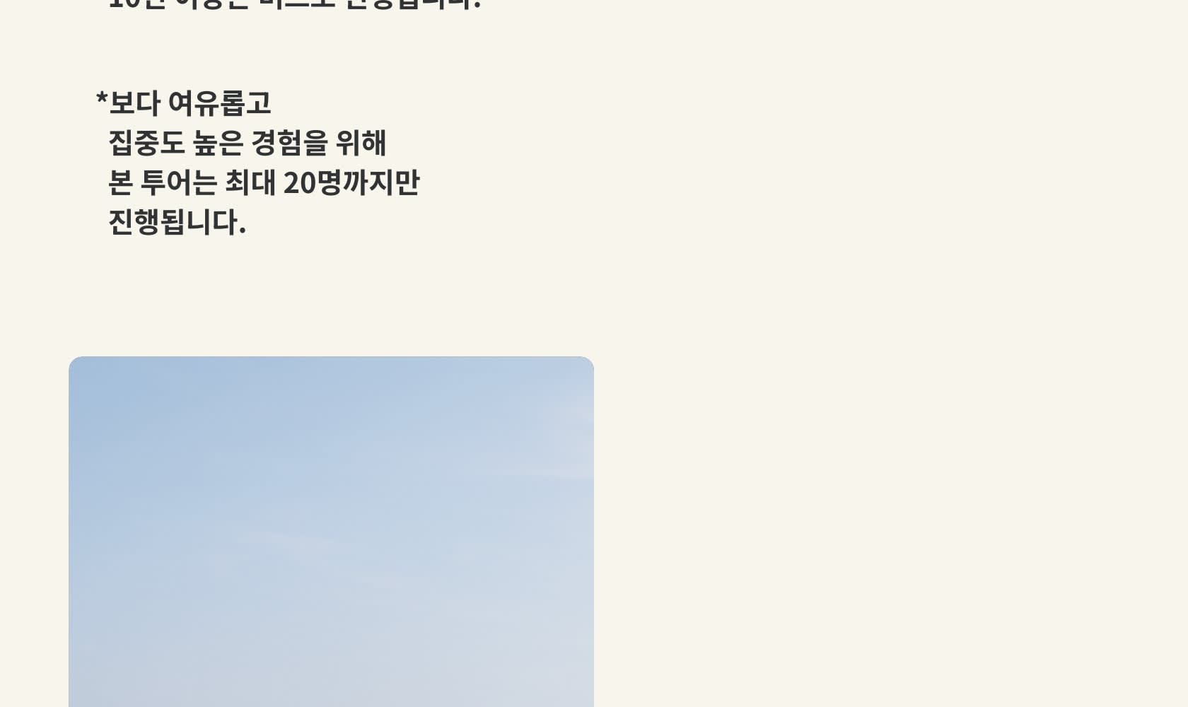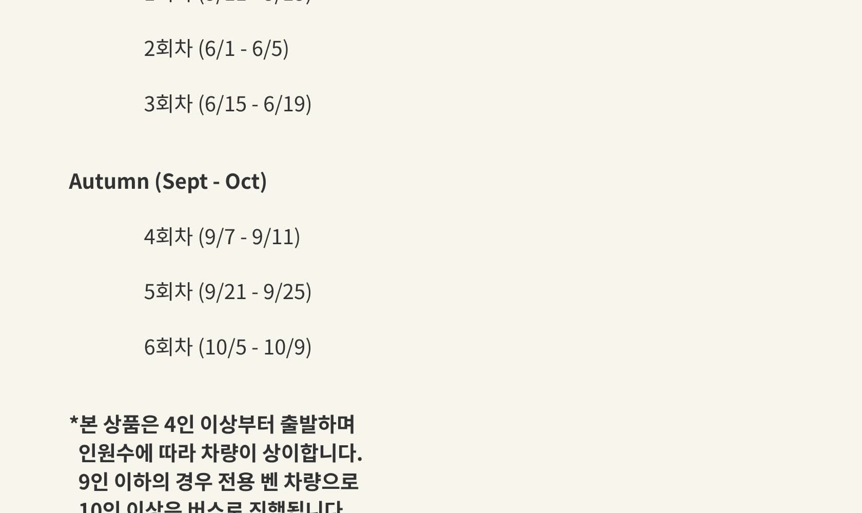 - 필수 확인 사항 🔹 최소 출발 인원 미달 시 투어는 취소될 수 있습니다. 🔹만 17세 이하 청소년은 보호자 동반 필수이며, 만 7세 미만 유아는 안전상의 이유로 참여가 불가합니다. 🔹유모차 및 휠체어 이용 고객은 투어 참여가 어렵습니다. 🔹모든 여행자의 시간을 존중하여 미팅 시간에 맞춰 정시 출발합니다. 지각 시 개별 합류가 불가하오니, 반드시 시간을 준수해 주세요. 🔹여권은 필수 지참입니다. 지방 투어의 경우 고속도로 검문이 있을 수 있으며, 여권 미소지 시 불이익이 발생할 수 있습니다. (사본 불가) 🔹소지품 분실 및 도난에 유의해 주세요. 귀중품은 투어 중 지참하지 않으시길 권장드리며, 분실 시 당사는 도움을 드리기 어렵습니다. 🔹개별 여행자 보험 가입을 권장드립니다. 보험 가입 시 여행 전 기간(출발일~귀국일)을 포함해 주세요. 🔹투어 당일 로밍폰 전원을 켜두시고, 유심 사용 등으로 연락처 변경 시 반드시 사전에 안내해 주세요. 🔹현지 상황(교통, 날씨, 파업 등)에 따라 투어 동선 및 소요 시간이 변경될 수 있습니다. 장거리 차량 이동이 포함된 투어입니다. 차멀미가 있으신 분은 멀미약 및 개인 상비약을 준비해 주세요. 🔹본 상품은 4인 이상 출발이며, 인원에 따라 차량이 배정됩니다. - 9인 이하: 전용 벤 차량 - 10인 이상: 버스 이동