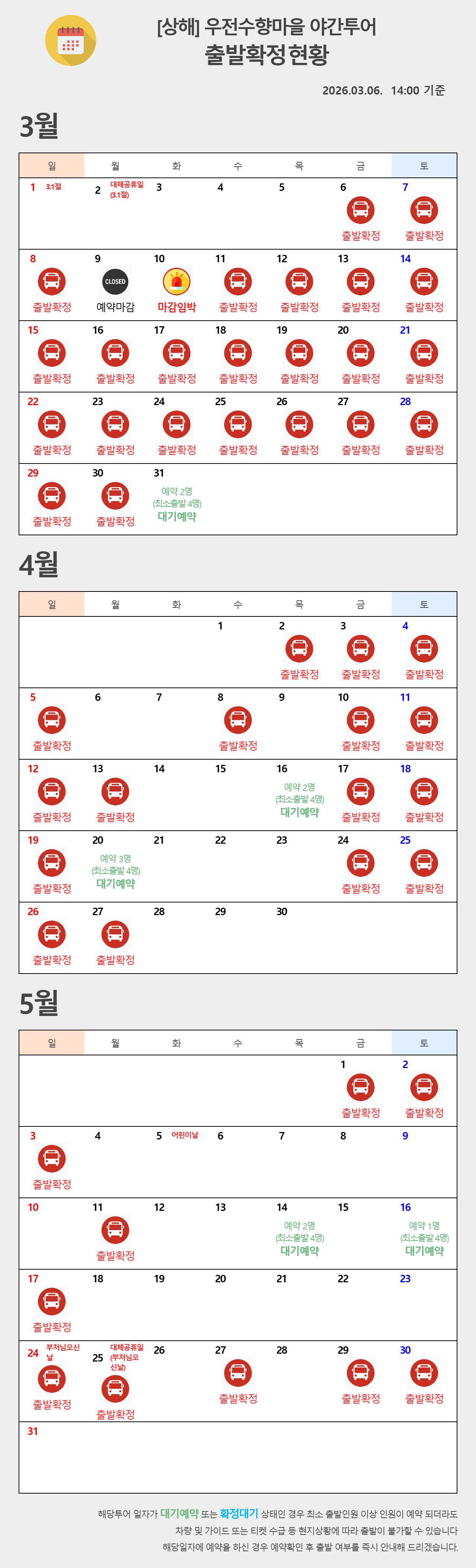 본 상품은 4인이상 모객 출발상품 입니다. 성인요금(만6세이상), 아동요금(만2세이상~만6세미만), 유아요금(만2세미만/무료), 경로요금(만70세이상/아동요금과 동일) 본 일정의 교통수단은 합승 형태이기 때문에 다른 고객분들과 함께 승차합니다. 미팅시간을 꼭 준수하여 주시기 바랍니다. 사전연락없이 미팅시간에 늦을 경우 별도 통지없이 출발합니다. 확정안내 및 확정바우처를 받기 전까지는 예약확정이 아닙니다. 현지 상황에 따라 예약 불가 및 환불 처리 될 수도 있습니다.