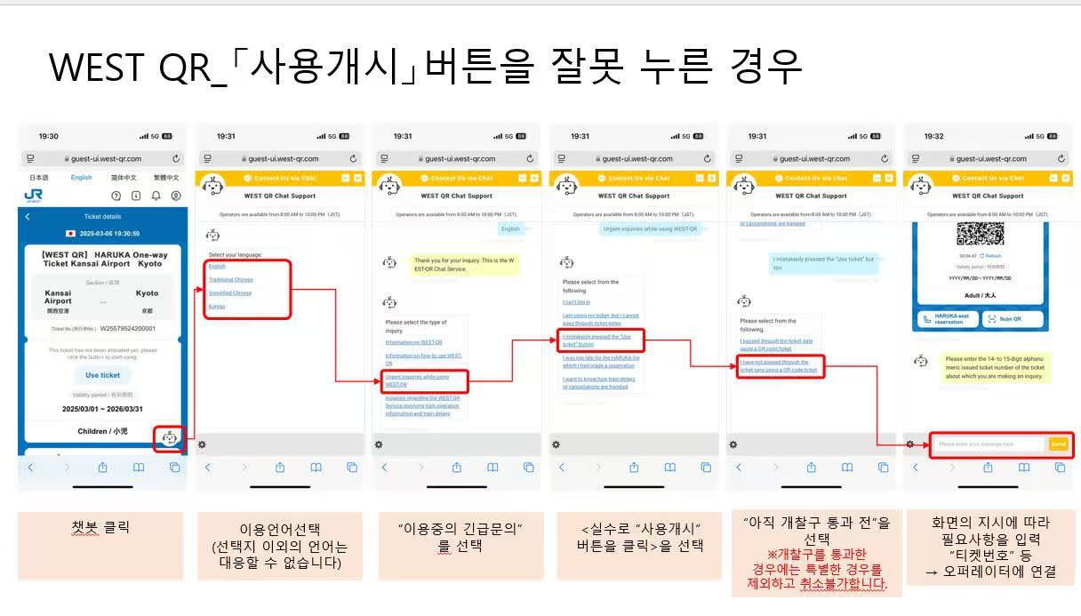 - 실수로 사용개시(Use Ticket) 버튼을 클릭하여 QR코드가 활성화된 경우에는 앱 하단의 챗봇 아이콘을 클릭하여 문의해주세요. 티켓 사용여부 확인후 무효화 처리 안내드립니다. 만약, 해당 열차가 이미 출발한 뒤라면 불가합니다.