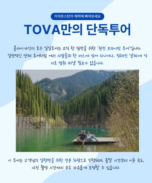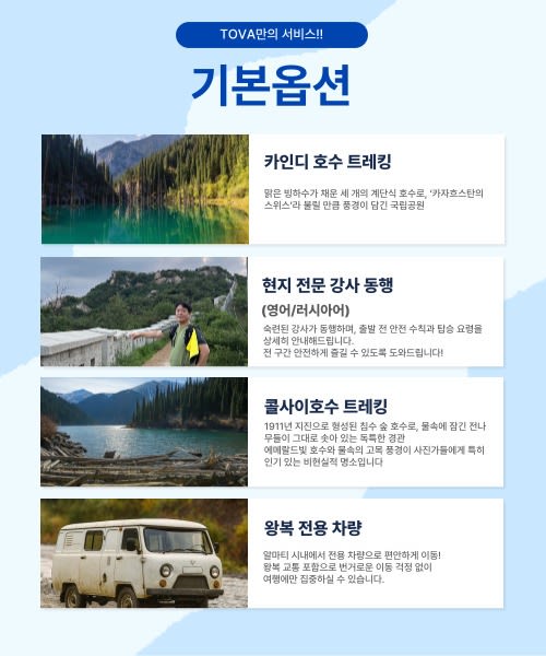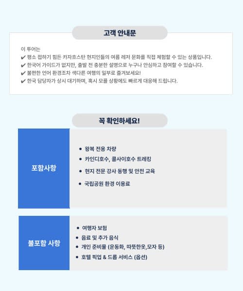 🅾️ 포함사항 - 왕복 전용 차량 - 카인디 호수·콜사이 호수 트래킹 - 현지 전문 강사 동행 및 안전 교육 - 국립공원 환경 이용료 ❎ 불포함사항 - 여행자 보험 - 음료 및 추가 음식 - 개인 준비물(운동화, 따뜻한 옷, 모자 등) - 호텔 픽업 및 드롭 서비스 ☝️ 안내사항 - 평소 접하기 어려운 카자흐스탄 현지의 여름 레저 문화를 직접 경험할 수 있는 상품입니다. - 한국어 가이드는 없지만, 출발 전 충분한 사전 설명이 제공되어 누구나 안심하고 참여할 수 있습니다. - 언어 환경의 불편함도 색다른 여행 경험으로 느껴보세요. - 한국 담당자가 상시 대기하여 예기치 않은 상황에도 빠르게 대응해 드립니다.