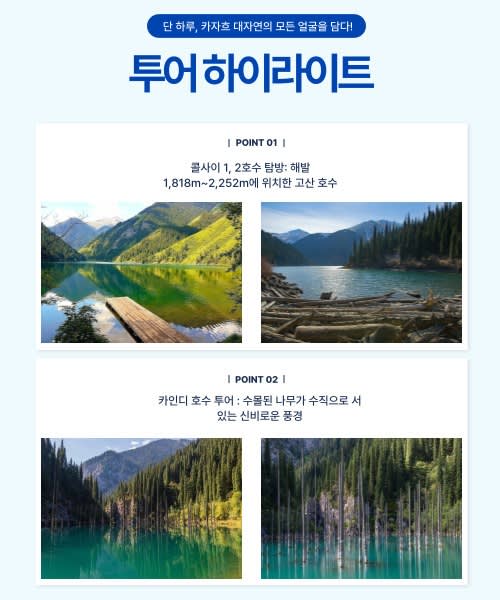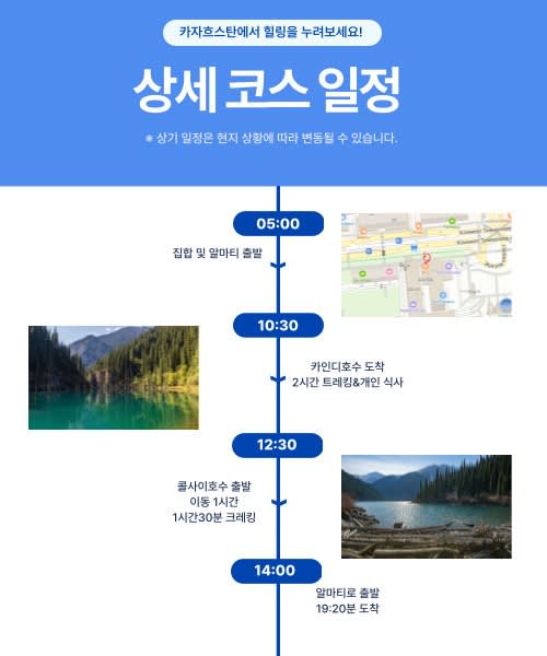 집합 및 알마티 출발 - 카인디 호수 트래킹 - 개인 식사 - 콜사이 호수 트래킹 - 알마티 복귀 - 투어 종료