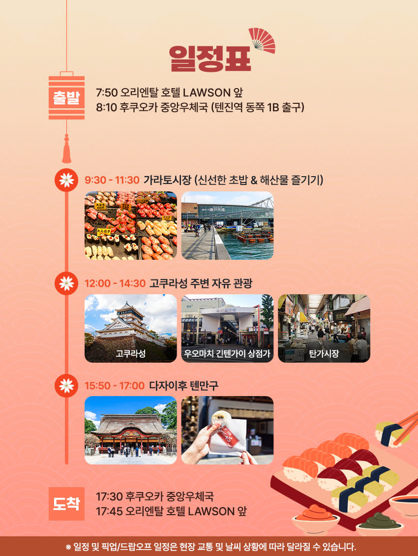 🚌 이 투어는 가라토시장에서 스시🍣를 맛보고 고쿠라성 지역으로 가서 인근 로컬 시장들에서 여러가지 간식 🍗을 먹고 마지막으로는 후쿠오카에 왔으면 빠질 수 없는 다자이후 텐만구로 향합니다!