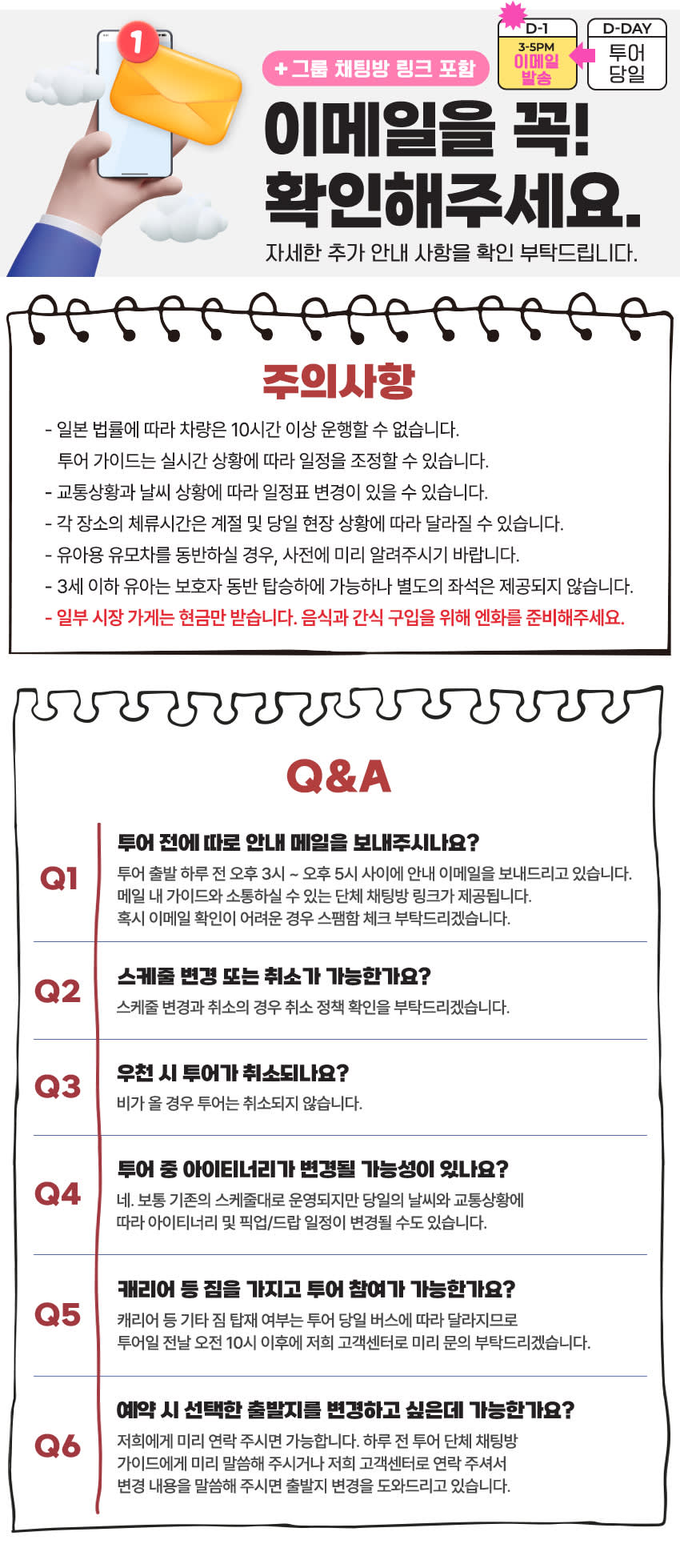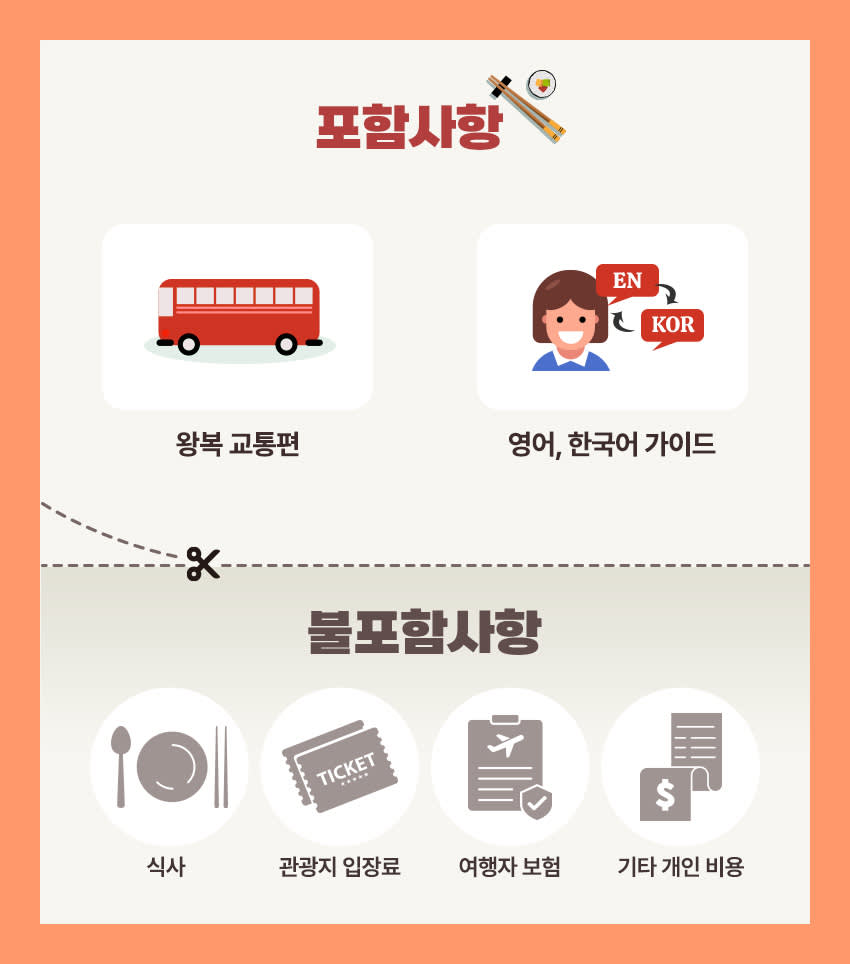 📨 투어 출발 하루 전, 오후 3시~5시 사이에 안내 이메일을 보내드리고 있습니다. 메일 내 가이드와 소통하실 수 있는 단체 채팅방 링크가 제공되오니 꼭 확인해 주세요. 혹시 이메일 확인이 어려우실 경우 스팸함을 체크 부탁드리겠습니다. • 출발 10분 전까지 출발지에서 대기해 주세요. 탑승 시간에 늦으실 경우 환불이 어려운 점 양해 부탁드립니다. • 일정은 당일 교통 상황이나 날씨에 따라 변경될 수 있는 점 양해 부탁드립니다. • 비가 올 경우 투어는 취소되지 않습니다. • 예약 인원에 따라 스타렉스 또는 버스로 운행될 수 있으며, 사전 좌석 지정은 불가능합니다. • 투어 관련 변동 사항 있을 시 별도 이메일 안내 예정입니다. • 개인 여행자 보험은 포함되지 않으니, 필요시 꼭 별도 여행자보험 가입을 권장드립니다. ※ 유모차 이용 안내 유모차 이용은 가능합니다. 다만, 일부 장소 및 일정에 따라 제약이 있을 수 있으므로 사전 문의 부탁드립니다. ※ 휠체어 이용 안내 현지 이동 환경(계단, 경사로 미비 등)으로 인해 휠체어 이용은 어렵습니다. 이용에 참고 부탁드립니다.