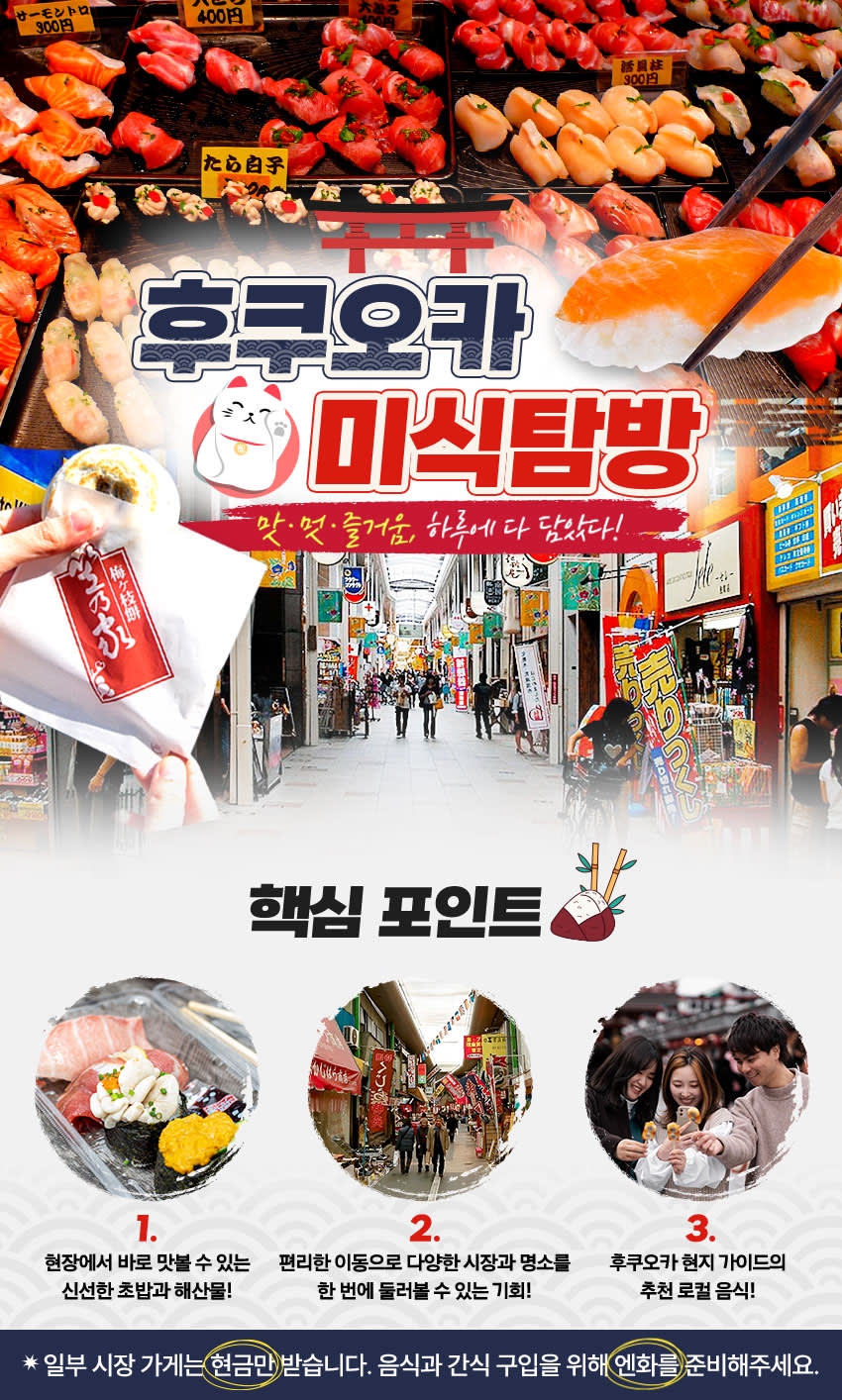 ※ 구매와 동시에 예약이 확정됩니다. ※ 별도의 최소 출발 인원은 없습니다. (1인 예약 가능) 📢 개별 식사 및 간식 비용은 투어 상품에 포함되어 있지 않습니다. 📢 일부 시장의 가게들은 현금만 받으니, 엔화를 충분히 준비해주세요. 📢 주말에는 교통 체증으로 인해 일정 순서가 반대로 진행될 수 있습니다. 📢 각 장소의 체류시간은 계절 및 당일 현장 상황에 따라 달라질 수 있습니다. 📢 호텔 픽업/드랍 서비스는 제공하지 않습니다. [안내사항] - 본 상품은 성인 1인 이상 구매 시 이용 가능합니다. 구매 전 반드시 확인 부탁드립니다. - 소인 옵션만 구매 시 예약이 취소 처리될 수 있으며, 이 경우 재구매가 필요하니 반드시 성인 1인 이상 선택 후 결제해 주시기 바랍니다. - 대인 (만 13세 이상) - 소인 (만 3세 이상~만 12세 이하) - 유아 (만 3세 미만 유아는 무료이나, 좌석 이용이 불가능합니다)