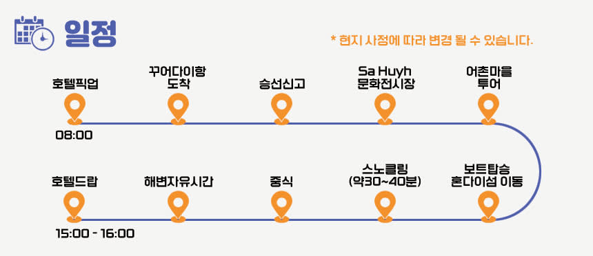 [포함사항] - 왕복 차량 - 참섬 어촌마을 투어 (Sa Huynh문화 전시장, 사원, 시장 등) - 영어 가능 현지 가이드 - 스노클링 장비 및 생수 1병 - BBQ 점심 식사 [불포함사항] - 개인 경비 - 개인 타월 (리조트에서 챙겨오시길 바랍니다) 📌 [주의 사항] - 천재지변(기상악화, 태풍, 지진 등)으로 인해 투어 진행이 불가할 수 있습니다. - 기상악화로 투어진행여부는 참섬 코스트가드(해얀경비대)에서 진행여부가 판단됩니다. - 차량정체로 다음 스케줄은 여유있게 잡아주시기 바랍니다. - 호흡기 질환 및 수술 경험이 있으신 분은 투어 진행이 어렵습니다. - 보청기 및 귀마개 착용을 하셔야 하는 분은 안전 상의 이유로 투어 진행이 어렵습니다. - 수상 액티비티로 전신 질환, 육체적, 정신적 컨디션이 좋지 않은 분은 이용에 주의해주시기 바라며 예약 시 문의해주셔야 합니다. - 구명조끼 착용이 필수이며 안전 요원 없는 곳에서 개별 행동을 피해주시기 바랍니다. - 투어진행 중 음주를 하실 수 없습니다. - 개인 부주의로 인한 부상 시 여행자 보험을 통해 처리되며 현지 치료에 따른 영수증을 챙겨오시길 바랍니다. - 여행자 보험은 개별적으로 반드시 가입하여 주시길 바랍니다.