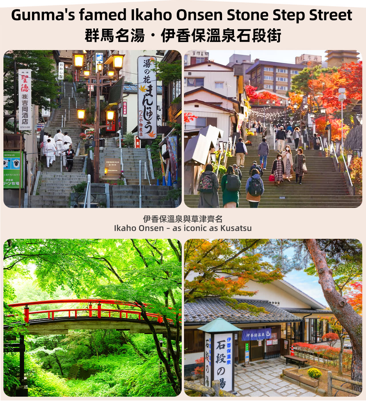 • * 두 번째 목적지: 하라다 농장(과일 따기 비용 포함)은 일본 전원 생활의 즐거움을 만끽할 수 있는 최고의 장소입니다! 12월~5월에는 달콤한 딸기, 6월~7월은 체리, 7월~8월은 블루베리, 8월~9월은 복숭아, 9월~10월은 포도, 10월~12월은 사과를 딸 수 있습니다. 갓 딴 신선한 제철 과일을 맛보며 가장 정통적인 농촌의 즐거움을 느껴보세요. 계절 한정 체험: ▼다마하라 라벤더 공원(7월 1일~8월 31일): 간토 지역 최대 규모의 라벤더 꽃밭으로, 5만 그루 이상의 라벤더가 만개하며, 케이블카를 타고 보라색 바다를 내려다보고, 특별한 라벤더 아이스크림을 맛볼 수도 있습니다. (입장권 포함) ▼다니가와라 스키장(12월 20일~4월 05일): 가족을 위해 설계된 눈 놀이 공원으로, 눈썰매, 눈 위에서 즐기는 에어바운스 등 재미있는 액티비티를 체험할 수 있습니다. (입장권 및 눈썰매 포함) ▼이카호 온천 거리(4월 6일~6월 30일, 9월 1일~12월 19일): 365개의 돌계단을 거닐며 천년 역사의 '황금 탕'과 '백은 탕'을 체험해보세요. 현지인들은 365개의 돌계단을 올라 이카호 신사에 도착하면 행운과 재물을 얻을 수 있다고 믿습니다.