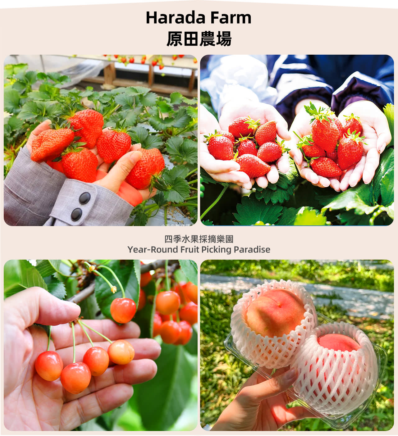 * 하라다 농장에서 제철 과일을 마음껏 수확하세요: 딸기, 체리, 블루베리, 복숭아, 포도, 사과 등 갓 딴 신선한 과일을 맛보세요.