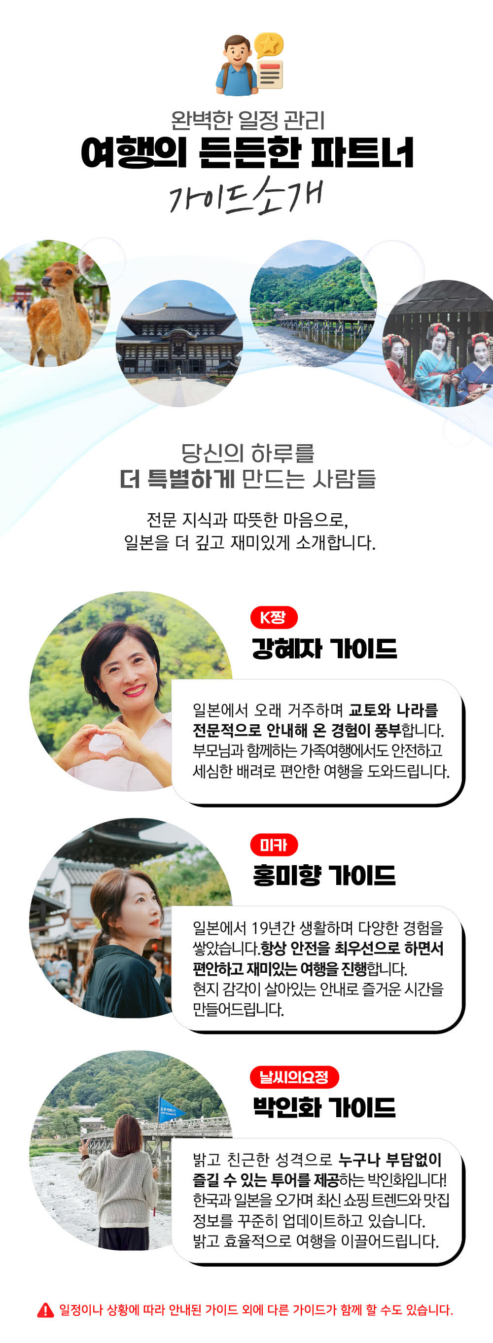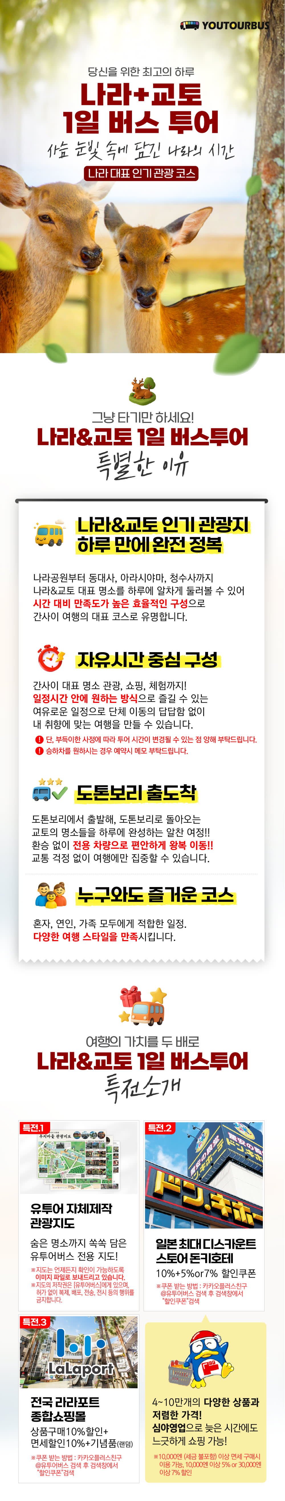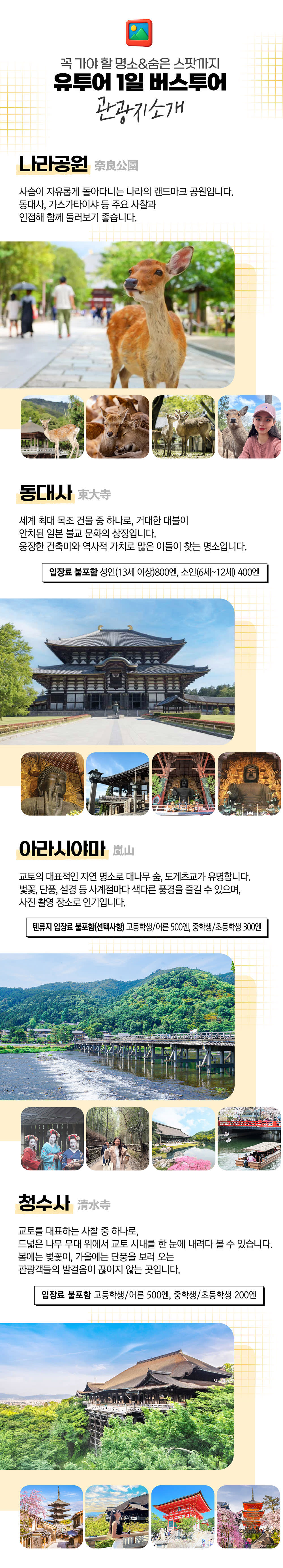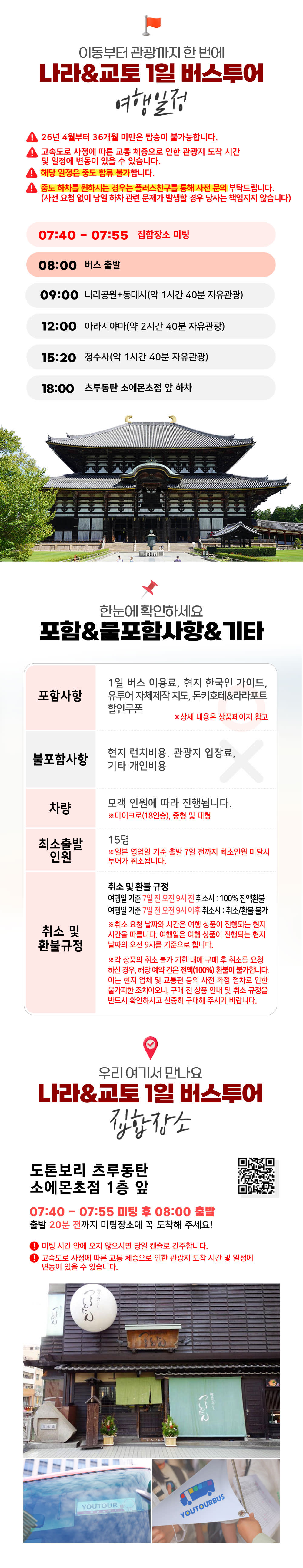 [포함사항] · 1일 버스 이용료 · 현지 한국인 가이드 · 유투어 자체제작 지도 · 돈키호테&라라포트 할인쿠폰 [불포함사항] · 현지 런치 비용 · 각 여행지 입장료 *동대사(선택사항) : 성인(13세 이상)800엔, 소인(6세~12세) 400엔 *텐류지(선택사항) : 고등학생/어른 500엔, 중학생/초등학생 300엔 *청수사(필수) : 고등학생/어른 500엔, 중학생/초등학생 200엔 · 기타 개인 비용 ✔️ NOTICE ▶ 최소 출발 : 15명~ - 본 상품의 최소 출발 인원은 15명부터입니다. (일본 현지 영업일 기준 7일 전 마감) - 2026년 4월부터 36개월 미만 영유아는 안전상의 사유로 투어 탑승이 불가합니다. [특전] 01 유투어 자체 제작 지도 제공 02 돈키호테 면세할인쿠폰특전 제공(최대 10%+5%or7%할인) 03 전국 라라포트 종합쇼핑몰 상품구매 10%+면세 10%+기념품(랜덤) 🚩 [MEETING] 미팅 시간 07:40 - 07:55 미팅 시간에 늦으면 당일 캔슬로 간주합니다. ▷ CHECK - 차량 형태 : 모객 인원에 따라 진행됩니다. 코뮤타(14인승), 마이크로(18인승), 중형 및 대형 - 현지의 도로와 교통 사정에 따라 시간 및 일정의 변동이 있을 수 있습니다. - 유투어버스에서는 항공기에 탑승하지 못 하는 것에 대한 책임을 지지 않습니다. - 버스 좌석은 지정석이 아닌 전 좌석 자유 승차임을 유의바랍니다. ▷ POINT - 일본 현지 '여행특별보상보험'이 가입된 상품 - 일본 여행 협회 JATA 정회원 및 일본 현지 1종 여행업 면허 등록 📞 취소/변경 수수료 (예약 확정 후 출발일로부터 일본 현지 영업일 기준) 모든 취소 및 문의는 공휴일을 제외한 일본 현지 기준 평일 업무 시간 (10:00 - 17:00) 한국 070-5213-2608 / 일본 092-292-0624