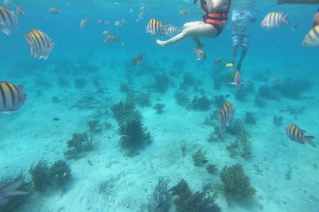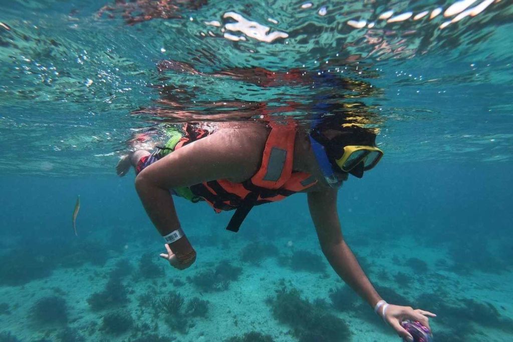 하루는 산호초로 향하는 스릴 넘치는 항해로 시작하여 활기찬 해양 생물 사이에서 스노클링을 즐기게 됩니다. 수중 세계를 탐험하며 수정처럼 맑은 바닷속의 평온함을 만끽하세요. 그런 다음 카타마란으로 돌아와 이슬라 무헤레스로 항해하면서 맛있는 음료를 즐겨보세요. 오픈 바에서는 다양한 음료가 준비되어 있어 기분 전환을 도와줍니다.