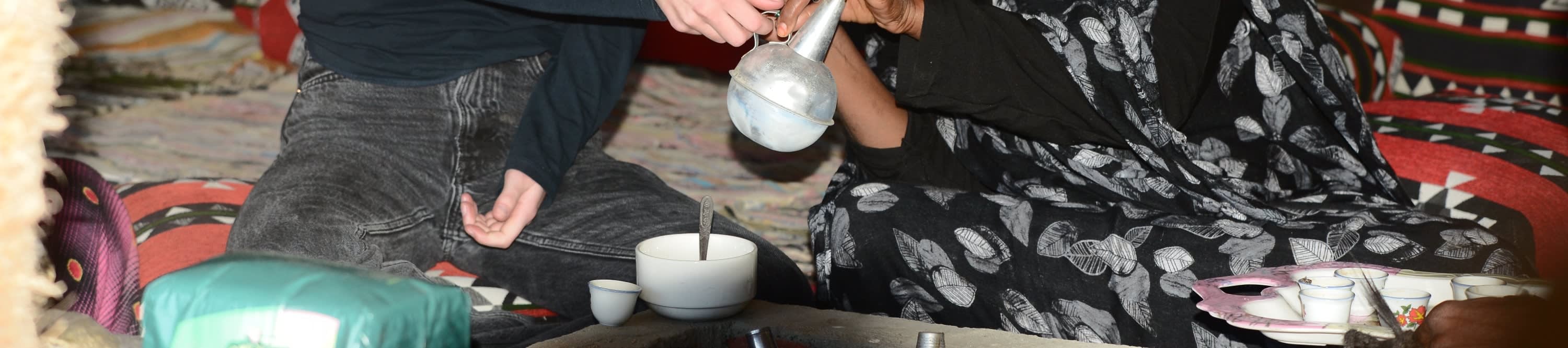 캠프에서 직접 빵을 만들고 베두인 사람들이 모닥불 위에서 빵을 준비하는 모습을 관찰할 기회가 있습니다! 나중에 작은 절벽에 올라 숨 막히는 일몰 경치를 감상할 것입니다. 그 후, "쌀밥, 토마토를 곁들인 감자, 닭고기, 코프타, 야채 샐러드, 타히니 샐러드"로 구성된 군침 도는 갓 만든 베두인 저녁 식사를 맛보세요.