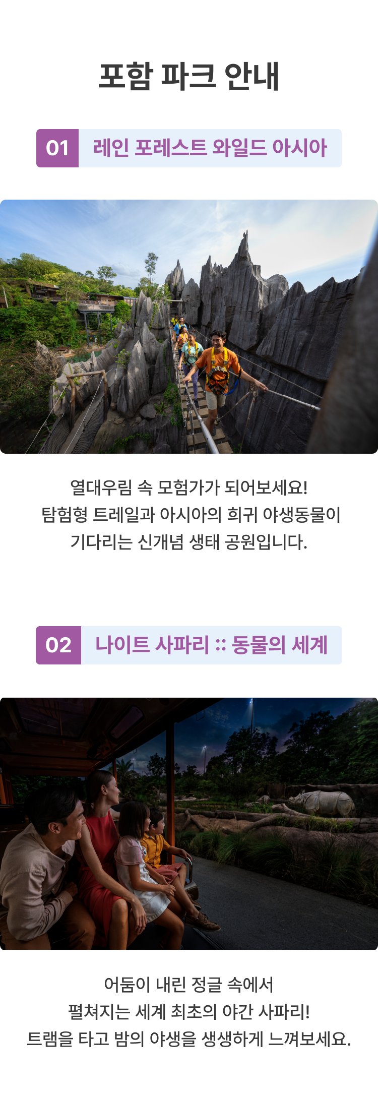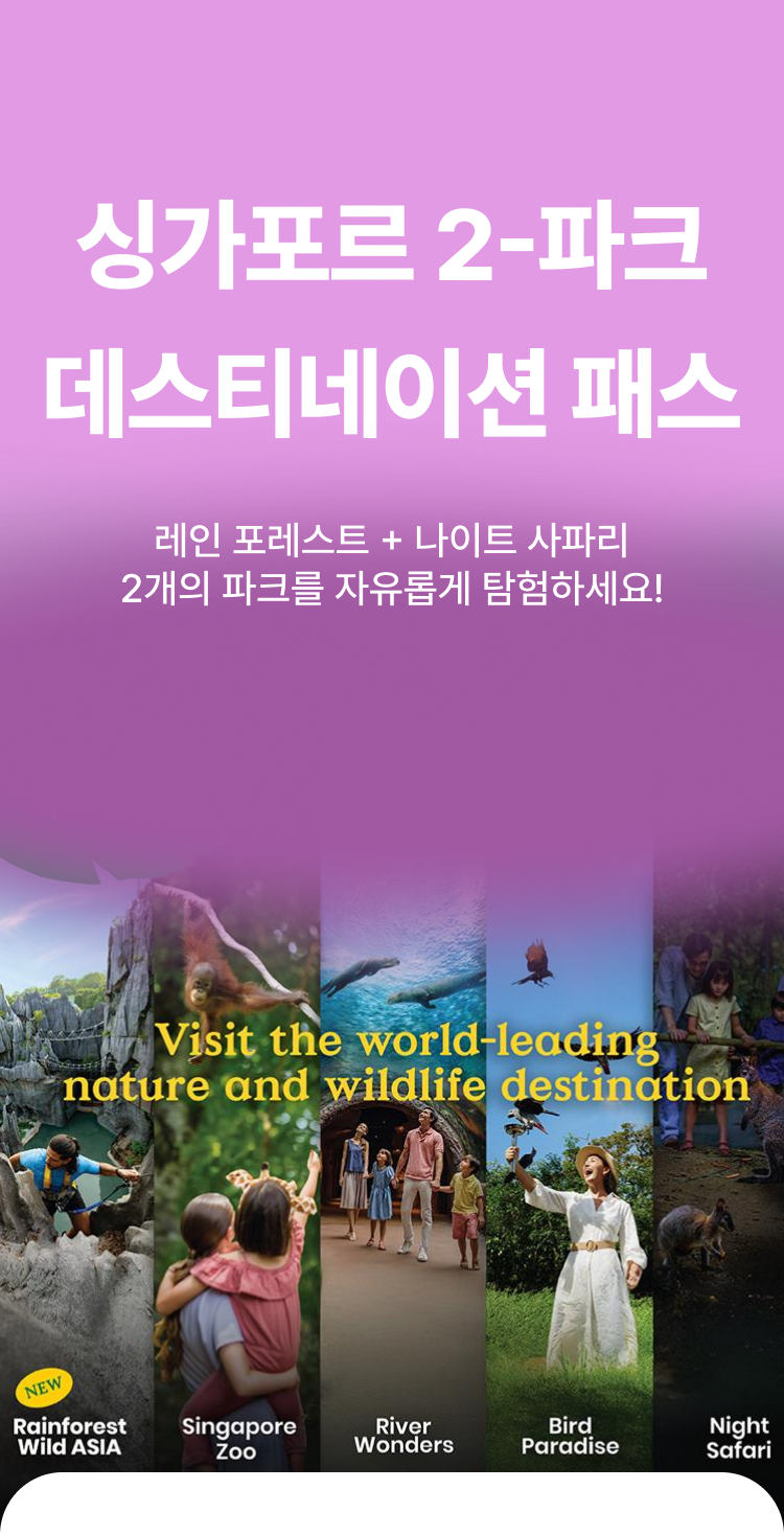 🐯 공원 입장 및 예약 안내 필수 예약 정보 예약 시, 나이트 사파리 방문 날짜와 시간을 반드시 선택해 주셔야 합니다. 선택하신 날짜와 시간에만 입장이 가능합니다. 티켓 유효 기간 및 포함 사항 선택하신 시작일로부터 5일간 유효합니다. 선택하신 조합에 포함된 각 공원에 1회씩 입장할 수 있습니다. 레인 포레스트, 나이트 사파리 입장 시 트램 탑승이 포함되어 있습니다. 연령별 입장 안내 3세 미만: 무료 입장이 가능하며, 연령 확인을 위해 신분증 제시가 필요합니다. 12세 미만 아동: 유료 입장권을 소지한 보호자와 반드시 동반해야 합니다. 취소 및 변경 규정 예약 완료 후에는 취소 또는 변경이 불가하오니 신중하게 결정해 주시기 바랍니다. ⚠️ 안전 수칙 및 공원 규칙 동물들에게 영향을 줄 수 있으므로, 향수나 강한 향이 나는 제품 사용을 자제해 주세요. 동물에게 먹이를 주거나, 만지거나, 놀리는 행위는 금지되어 있습니다. 동물들의 스트레스 방지를 위해 플래시를 이용한 촬영은 금지됩니다.