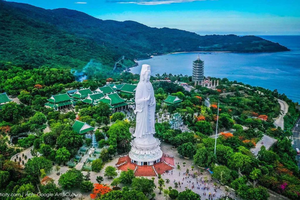 첫 번째 목적지는 손트라 반도(Monkey Mountain)에 위치한 린응사(Linh Ung Pagoda)입니다. 이 인상적인 탑은 다낭에서 가장 큰 탑으로, 웅장한 규모와 세련된 건축물로 유명합니다. 바다를 내려다볼 수 있는 이곳은 현대 베트남 불교의 중요한 상징이자 자연, 문화, 신앙이 어우러진 영적인 장소로 간주됩니다.