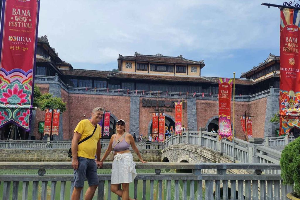 다음으로, 바나힐 리조트 단지 내에 위치한 황금다리로 이동합니다. 해발 1,414m 높이의 거대한 석조 손바닥 위에 떠 있는 듯한 이 상징적인 다리는 숨막히는 전망을 자랑하며 구름 사이를 떠다니는 산책로처럼 느껴집니다.