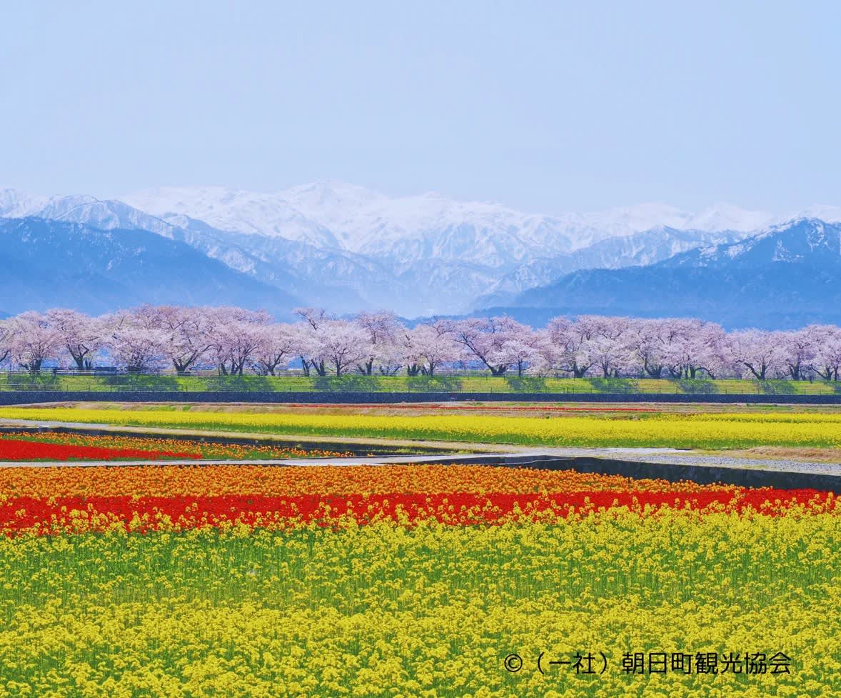 아사히 후나카와 봄의 사중주 벚꽃, 다채로운 튤립, 노란 유채꽃, 그리고 북알프스가 어우러져 만들어내는 숨 막히는 '봄의 사중주'를 즐겨보세요. 도야마현 아사히 마을의 후나카와 강을 따라 280그루 이상의 벚나무가 1,200미터에 걸쳐 늘어서 있어 맑은 강물에 비치는 멋진 터널을 이룹니다. 이 놀라운 풍경은 매년 유채꽃과 일찍 피는 튤립을 정성껏 심어 이 계절의 걸작을 보존하는 지역 후나카와 농부들의 헌신 덕분에 가능합니다.