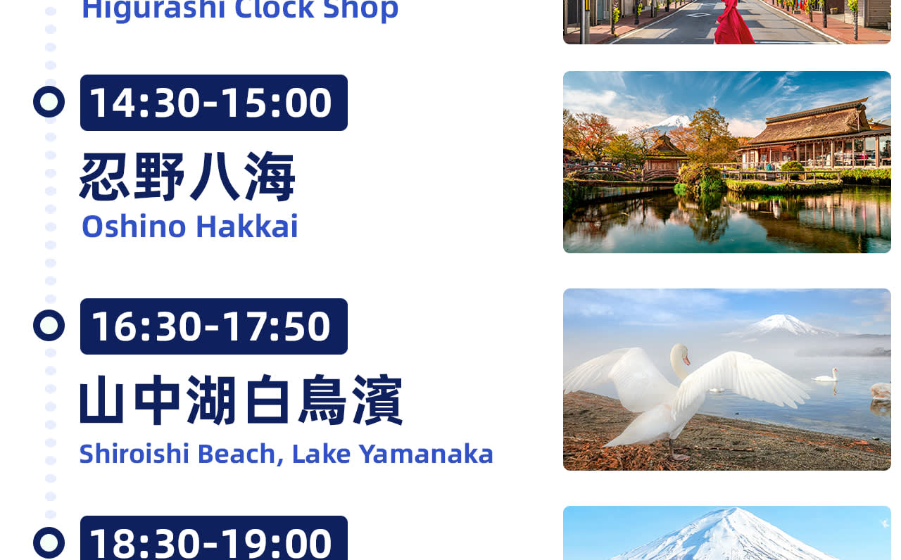 여행은 후지산의 클래식 및 인플루언서 랜드마크를 심층적으로 탐험할 수 있도록 안내합니다. '천국의 계단 마을' 닛카와 시계점에서 눈 덮인 산으로 이어지는 거리를 촬영하고, 오시노 핫카이에서 설산과 맑은 샘물의 조화를 감상하고, 조용한 야마나카 호수에서 '백조의 호수'의 평화로움을 느끼고, 가와구치 호수의 인기 있는 로손 편의점을 방문하세요.