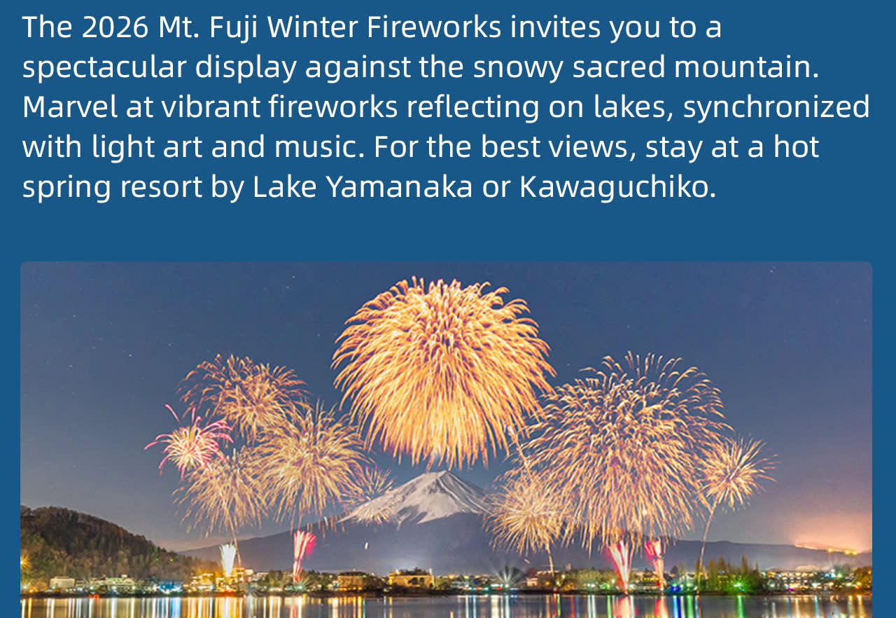 여행의 궁극적인 하이라이트는 눈 덮인 후지산을 배경으로 겨울 밤하늘에 펼쳐지는 화려한 불꽃놀이의 장관을 감상하는 것입니다. 이것은 단순한 관광이 아니라 소중히 간직할 가치가 있는 한정된 추억입니다.
