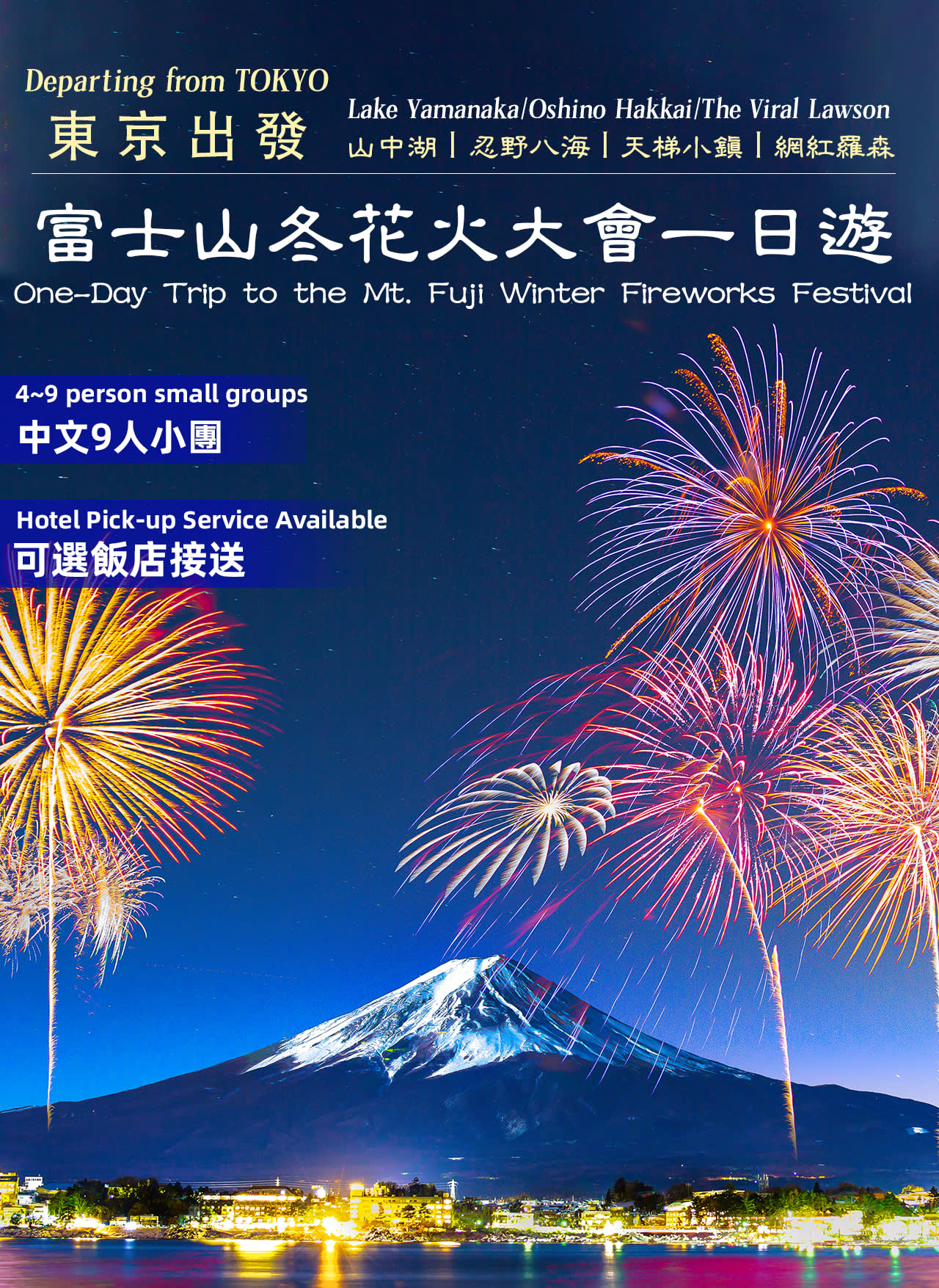 이번 겨울, 도시를 벗어나 후지산 아래에서 꿈결 같은 하루 여행을 시작하세요. 품질을 추구하는 여러분을 위해 9명 이내의 정교한 소규모 그룹을 만들어 도쿄 호텔 전용 차량 픽업의 편리함을 누릴 수 있습니다.
