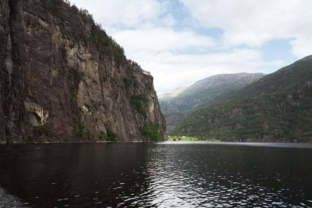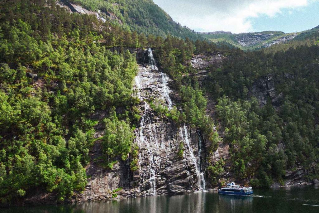 장엄한 산악 지형과 폭포가 있는 오스터피오르드를 탐험하세요. 피오르드 깊숙이 들어갈수록 가파르고 웅장한 산악 풍경이 펼쳐집니다. 선장이 배의 뱃머리를 폭포 가까이로 조종해 시원한 물보라를 느낄 수 있는 선데크에 올라보세요.