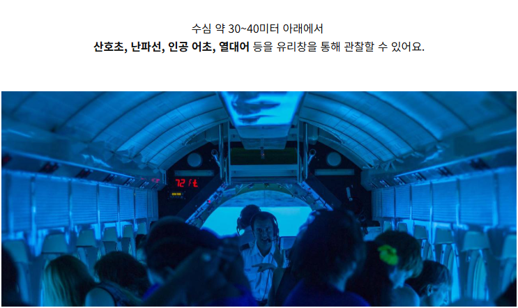 물속 30m까지 내려가며, 잠수함 내부의 독특한 느낌도 체험 가능합니다.