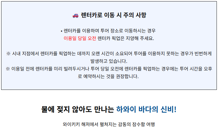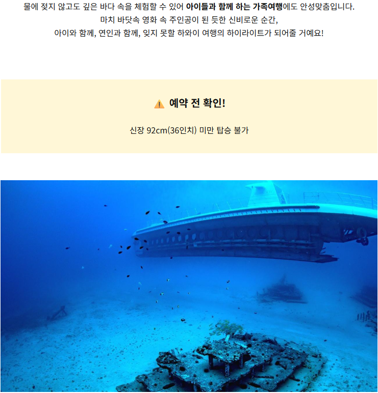 신장 92cm(36인치) 미만 아동은 탑승이 불가하오니, 어린 자녀와 함께 이용 시 반드시 확인해 주세요. 투어 시작 30분 전까지 체크인이 필요합니다. 실제 수중탐험은 약 45분간 진행됩니다. 선상은 미끄러울 수 있으니 슬리퍼 착용은 삼가 주시고, 편한 운동화나 미끄럼 방지 신발을 권장드립니다. 배 멀미가 있으신 분은 사전 멀미약 복용을 추천드립니다. 선상이 미끄러울 수 있으므로, 안전에 유의하시고 가급적 슬리퍼 착용은 삼가 바랍니다. 기상이나 현지 상황에 따라 투어 일정이 변경될 수 있습니다. 예약 후 지각이나 노쇼 시 변경 및 환불이 어렵습니다. 해외 여행 중 만일의 경우에 대비해 여행자 보험 가입을 권장합니다.