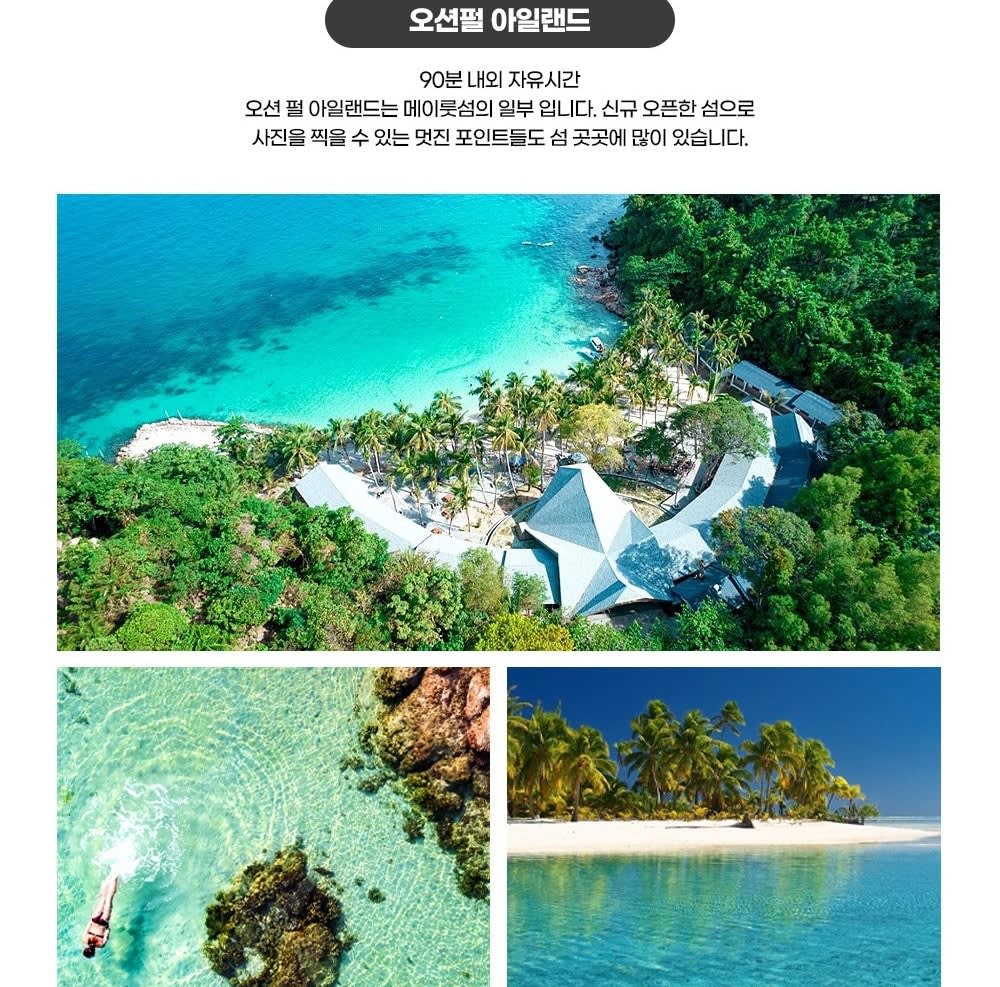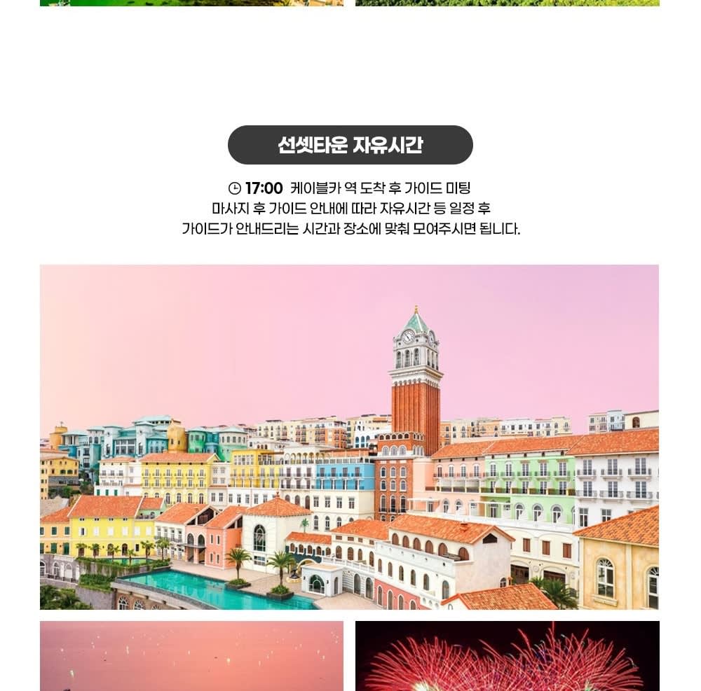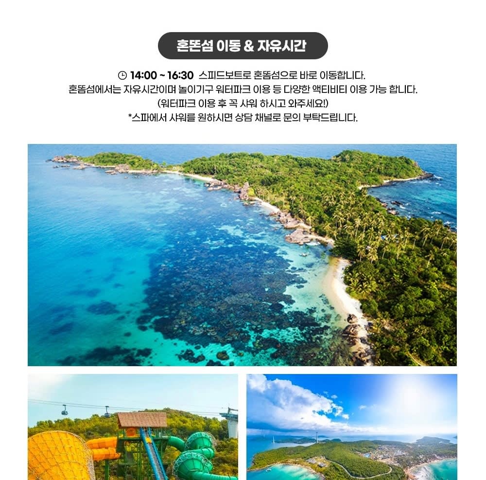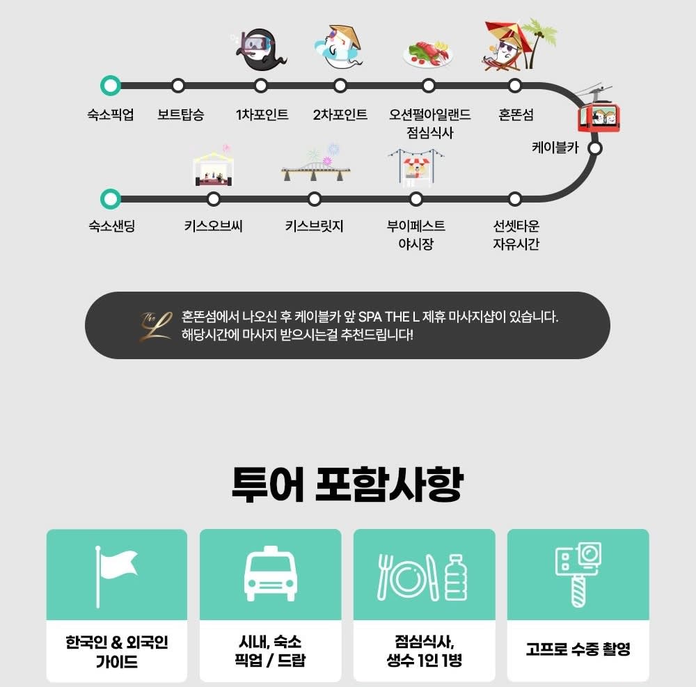 • 🚤 보트 탑승 & 스노클링 1차 포인트 🐠 스노클링 2차 포인트 🏝 오션펄아일랜드 & 혼똔섬 탐방 🚡 케이블카 탑승 후 선셋타운 이동 🌇 선셋타운 자유시간 (부이페스트 야시장·키스브릿지·키스오브씨 관람)