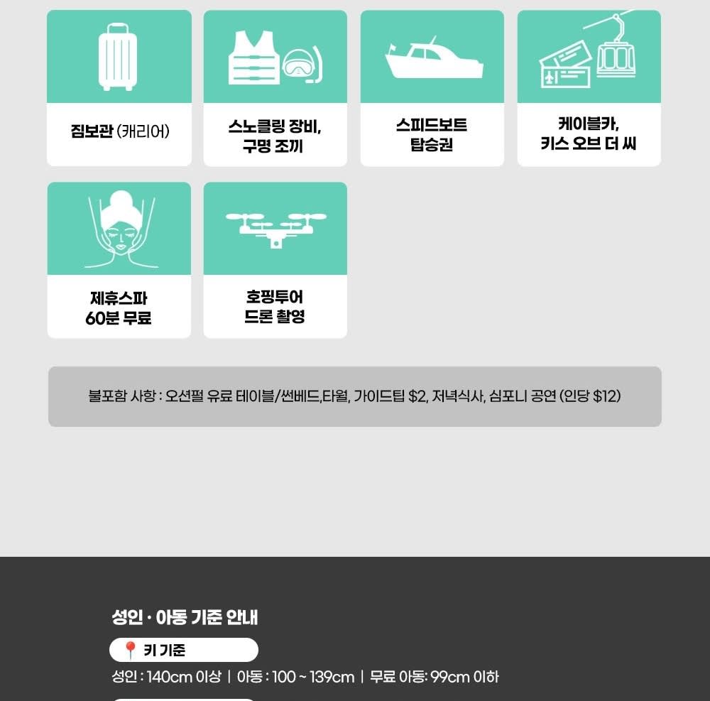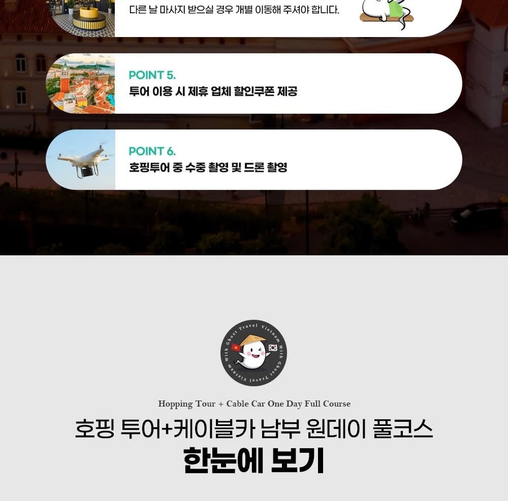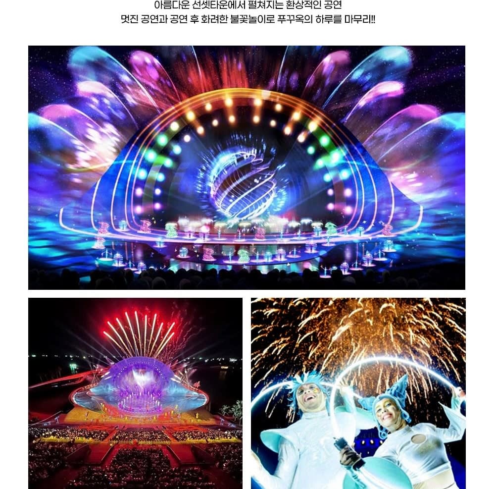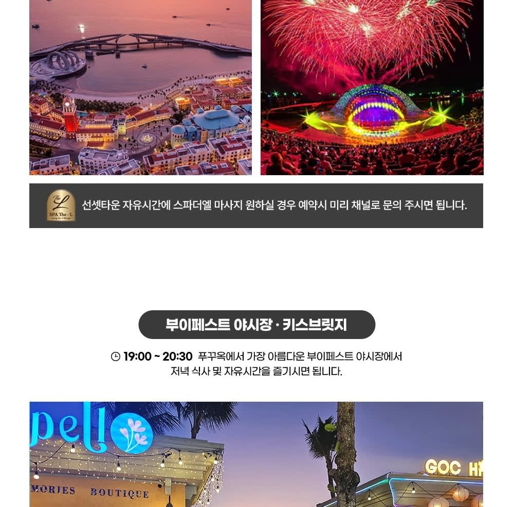 • 🚤 보트 탑승 & 스노클링 1차 포인트 🐠 스노클링 2차 포인트 🏝 오션펄아일랜드 & 혼똔섬 탐방 🚡 케이블카 탑승 후 선셋타운 이동 🌇 선셋타운 자유시간 (부이페스트 야시장·키스브릿지·키스오브씨 관람)