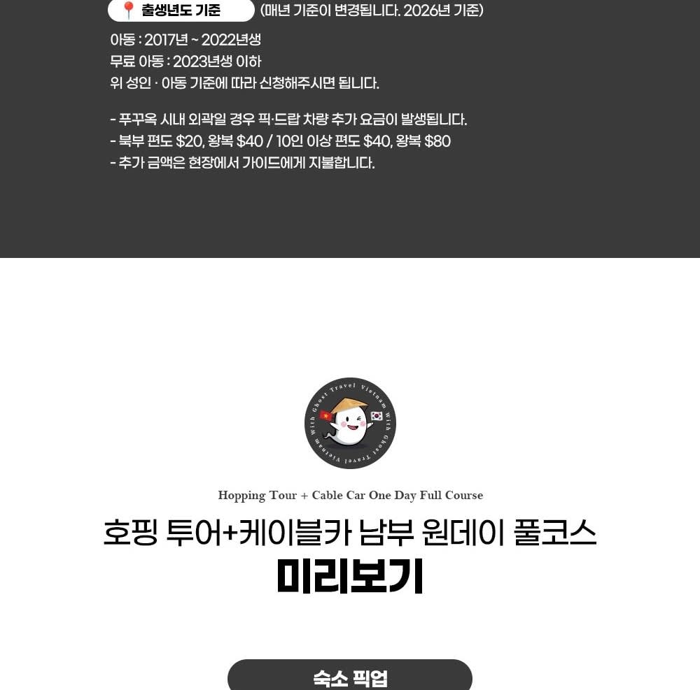 * 카카오채널로 연락주셔야 예약확정 가능하니 반드시 예약시에는 해당 카카오 채널로 연락바랍니다. (카톡검색시 @푸꾸옥고스트투어) * 베트남 국/공휴일에는 인건비, 차량비 등이 인상되는 관계로 추가금(현지지불 등)이 발생될 수 있습니다.
