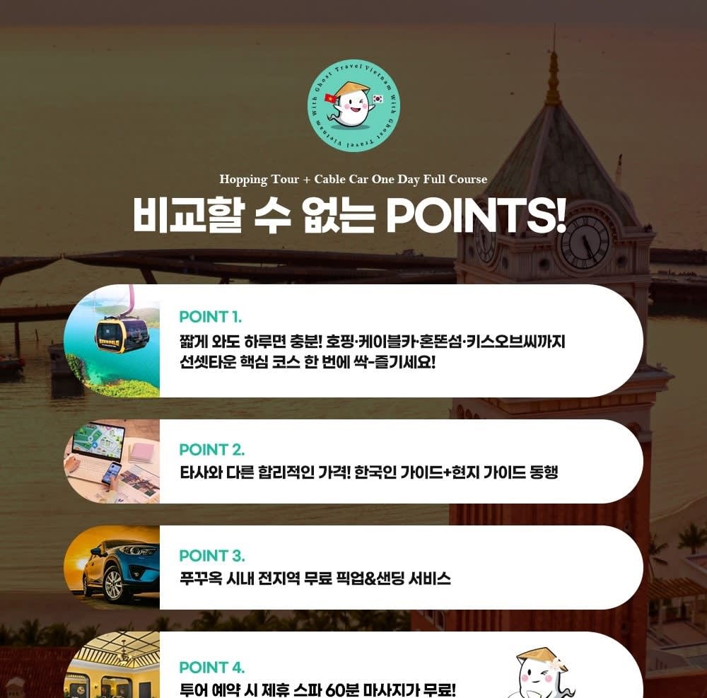 • 푸꾸옥 여행을 꿈꿔왔던 당신을 위해, 이 도시의 모든 로망과 하이라이트를 단 하루 만에 완벽하게 압축한 특별한 풀코스 투어를 소개합니다. 아침에는 푸꾸옥 남부의 에메랄드빛 바다로 나가 보물섬처럼 숨겨진 섬들 사이에서 즐기는 짜릿한 호핑과 스노쿨링을 경험하세요. 오후에는 세계 최장 케이블카를 타고 하늘을 가르며 아찔한 전경을 감상하고, 저녁에는 이국적인 선셋타운에서 자유를 만끽합니다. 한국인 가이드의 섬세한 케어와 푸꾸옥 시내 전 지역 무료 픽업/샌딩 서비스로, 당신은 오직 여행의 즐거움에만 집중할 수 있도록 준비했습니다!