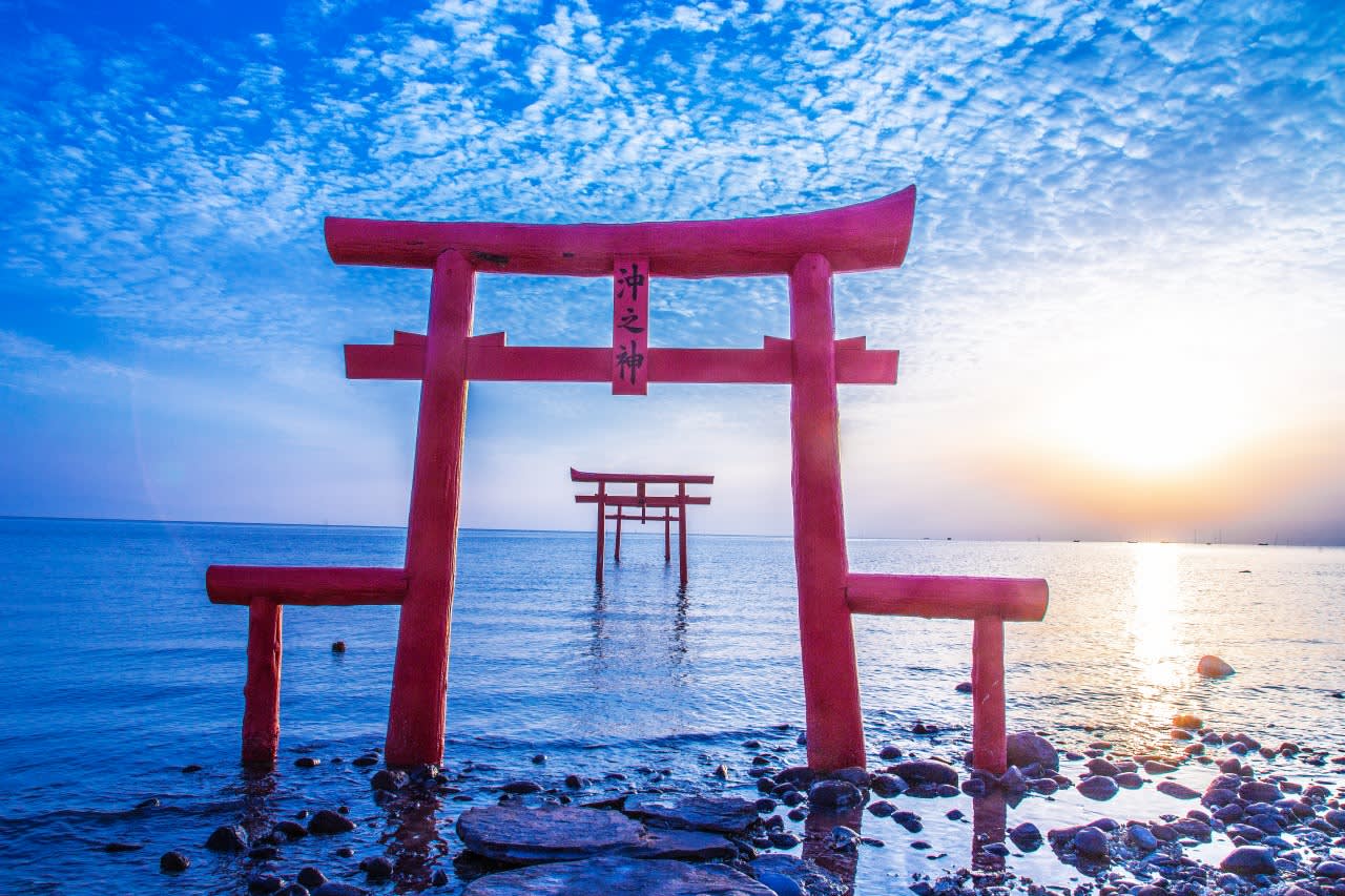【오오우오 신사 해중 도리이】 조수 간만 변화로 다양한 풍모를 드러내는 해중 도리이를 감상하세요. 규슈에서 가장 인기 있는 절경 사진 촬영 명소 중 하나입니다.