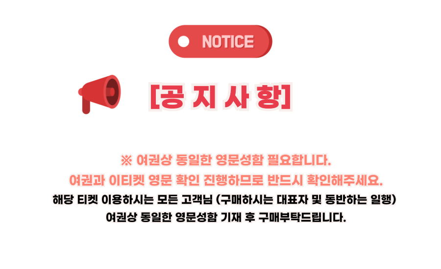 • 본 상품의 유효기간은 구매 후 90일 입니다. 티켓 이용 예정일이 구매날짜로부터 90일 이내인 경우에만 티켓을 구매해 주시기 바랍니다. 예약 시 선택 날짜는 참고용입니다.