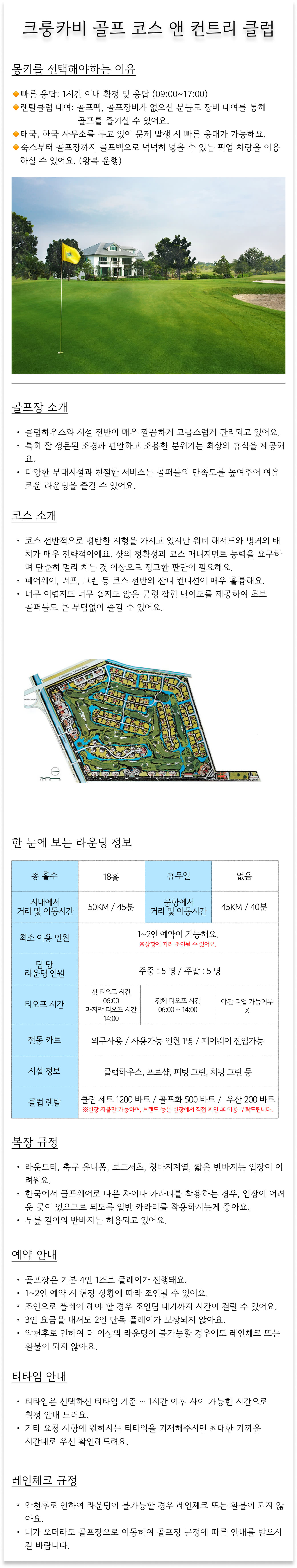 🍱 레스토랑 정보 - 레스토랑 운영 시간 06:00 ~ 20:00 🚗 차량 정보 - 승용차 : 1~3인, 골프백 3개 또는 골프백 2개 + 20인치 캐리어 2개 - 밴 : 1~9인, 골프백 8개 또는 골프백 6개 + 20인치 캐리어 6개 💲 캐디팁 - 태국의 골프장은 캐디피와 별도로 캐디팁을 반드시 지불해야해요. - 캐디팁은 골프장에 따라 조금씩 다르나, 18홀 당 500바트 이상의 캐디팁을 권장해요. - 캐디팁은 라운딩 종료 후 캐디에게 직접 지불해주시면 돼요. ❗ 기타 - 부득이하게 추가 금액이 발생 되는 경우, 예약 진행 시 사전 안내 드립니다. - 개별 여행자 보험 가입을 권장 드려요. - 토, 일요일 및 태국 공휴일에는 주말 요금이 적용돼요. - 현금 및 귀중품 분실과 개인 안전 사고에 유의해주세요. - 외부에서 구입한 음료 및 음식물은 필드로 반입이 불가능해요. 라운딩 전 적발 시 : 음식 및 음료 제외한 후 라운딩 시작 혹은 심한 경우에는 티오프 불가 (환불 불가) 라운딩 중 적발 시 : 라운딩 진행 불가 및 퇴장 조치 (환불 불가)