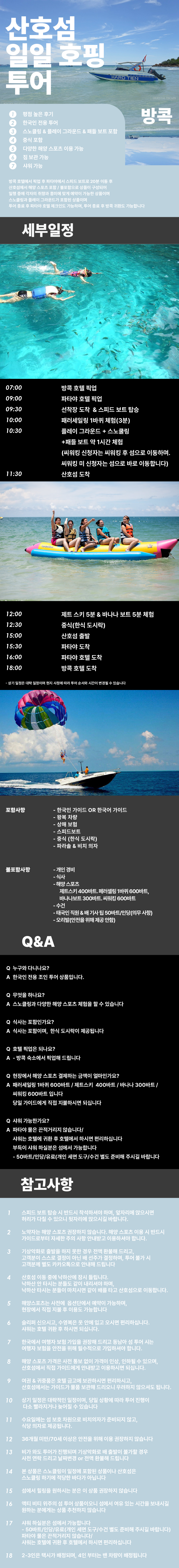 📌 [참고 사항] · 확정 시 방콕 호텔 픽업 시간 안내해 드리고, 파타야 스피드보트 탑승 시간이 있어서, 미팅 시간 반드시 지켜주셔야 합니다. · 파타야 도착 후 시간이 남은 경우 가볍게 쌀국수로 조식드신 후 투어 준비하시면 되십니다. · 호텔 미팅 시 1층 로비에 안 보이실 경우는 노쇼로 간주되며 날짜 변경과 전액 환불이 불가합니다. · 확정 시 본 상품 한국인 담당자 연락처와 카톡 아이디를 보내드리오니 당일 투어관련 우려 안 하셔도 되십니다. · 투어 종료 후 파타야 호텔로 드랍을 원하시는 분은 구매 시 파타야 호텔 남겨주시면 신속한 예약이 가능합니다. · 투어 종료 후 투어 사무실 내 샤워 시설을 이용할 수 있습니다. (50바트 / 불포함) · 기상 악화로 해양 스포츠를 이용 못 하실 경우는 100바트/바나나 보트, 150바트/제트스키, 200바트/페러셀링. 스노클링 환불 불가로 당일 가이드분이 바트로 돌려드립니다. · 매주 수요일에는 섬 보호 차원에서 비치 의자가 없습니다. 돗자리로 대체합니다. · 투어 종료 후 파타야 호텔 드랍 (옵션 C 차량 편도 추가 구매) or 방콕 호텔 드랍(옵션 D 차량 왕복 추가 구매)하시면 되십니다. · 파타야 바다는 푸켓과 달리 물고기가 많거나 물속이 아주 맑지 않아 스노클링에 큰 기대를 하시면 실망하십니다. 스노클링은 상품 구성 시 비용이 안 들어가서 포함시킨 상품으로 파도가 심한 날은 스노클링을 할 수가 없으며, 스노클링에 의한 부분 환불은 없습니다. 🌊 [해양 스포츠 이용 시 유의 사항] - 어린이 키 120cm 이하는 스노클링 이용이 어려울 수 있으니 참고 부탁드립니다. - 스노클링은 포함사항으로 기상 사정으로 진행되지 못할 경우 따로 환불되는 금액이 없습니다. - 제트스키 상품을 신청하신 분들은 5분 정도 타시는데 반드시 가이드와 동승하셔야 합니다. 가이드와 동승하지 않을 경우 발생하는 사고에 대해서는 고객님이 100% 책임을 지시고 현지 여행사는 보상하지 않습니다. 수리 비용이 상당히 비싸 이러한 문제를 발생하지 않게 하기 위해 가이드와 동승하셔야 합니다. - 바람이 심할 때는 고객님의 안전을 위해서 패러세일링을 진행하지 않는 것을 추천드립니다. - 스피드보트 탑승 시 허리가 안 좋으신 분이나 노약자는 절대 배 앞에 앉으시면 안되시고 이동시 에는 반드시 착석하셔야 합니다. - 페러세일링의 경우 몸무게 100kg 이상, 다리 쪽에 수술 자국이나 흉터가 있으면 이용 불가합니다. - 씨워킹은 이용이 불가합니다. - 반드시 섬에서는 가이드의 안내을 받으시고 개별 행동은 자제 부탁드립니다. - 연세가 있으신 분은 해양 스포츠를 하실 때 이용이 제한될 수 있습니다. - 본 상품은 보험은 포함이나 태국법에 근거한 보험이며, 한국에서 치료시는 적용이 안되는 보험이며, 한국에서 반드시 여행자 보험에 가입하실 것을 권장합니다.