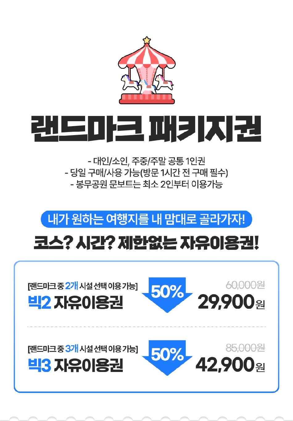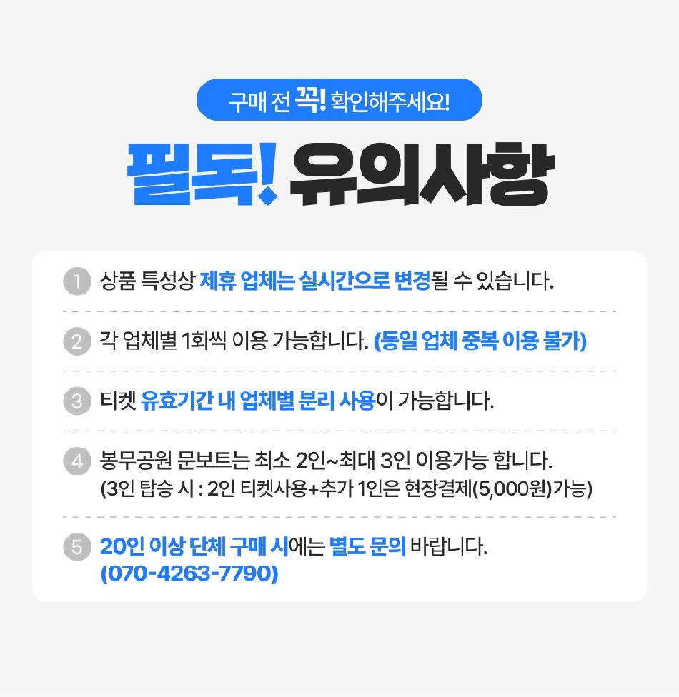 - 이용 방법 : QR/바코드 확인 후 입장- 유효기간 : 2025.09.26 ~ 2025.12.31- 당일이용 가능여부 : 당일 이용 가능 * 원활한 알림톡 수신 위해 연락처 확인 필수!