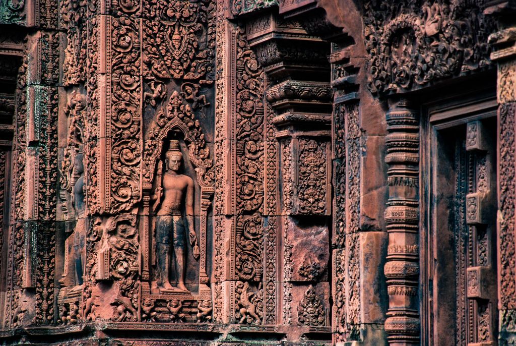 핑크 사암 사원으로도 잘 알려진 화려하게 조각된 반티에이 스레이를 둘러 봅니다.