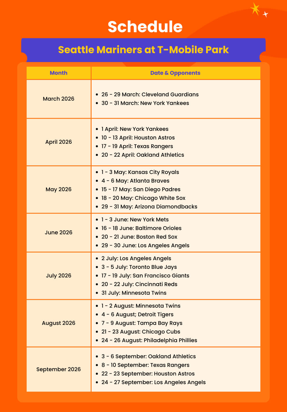 * 이번 시즌 시애틀에서 매리너스 일정표에서 선택하여 최고의 MLB 팀 경기를 라이브로 관람하세요.