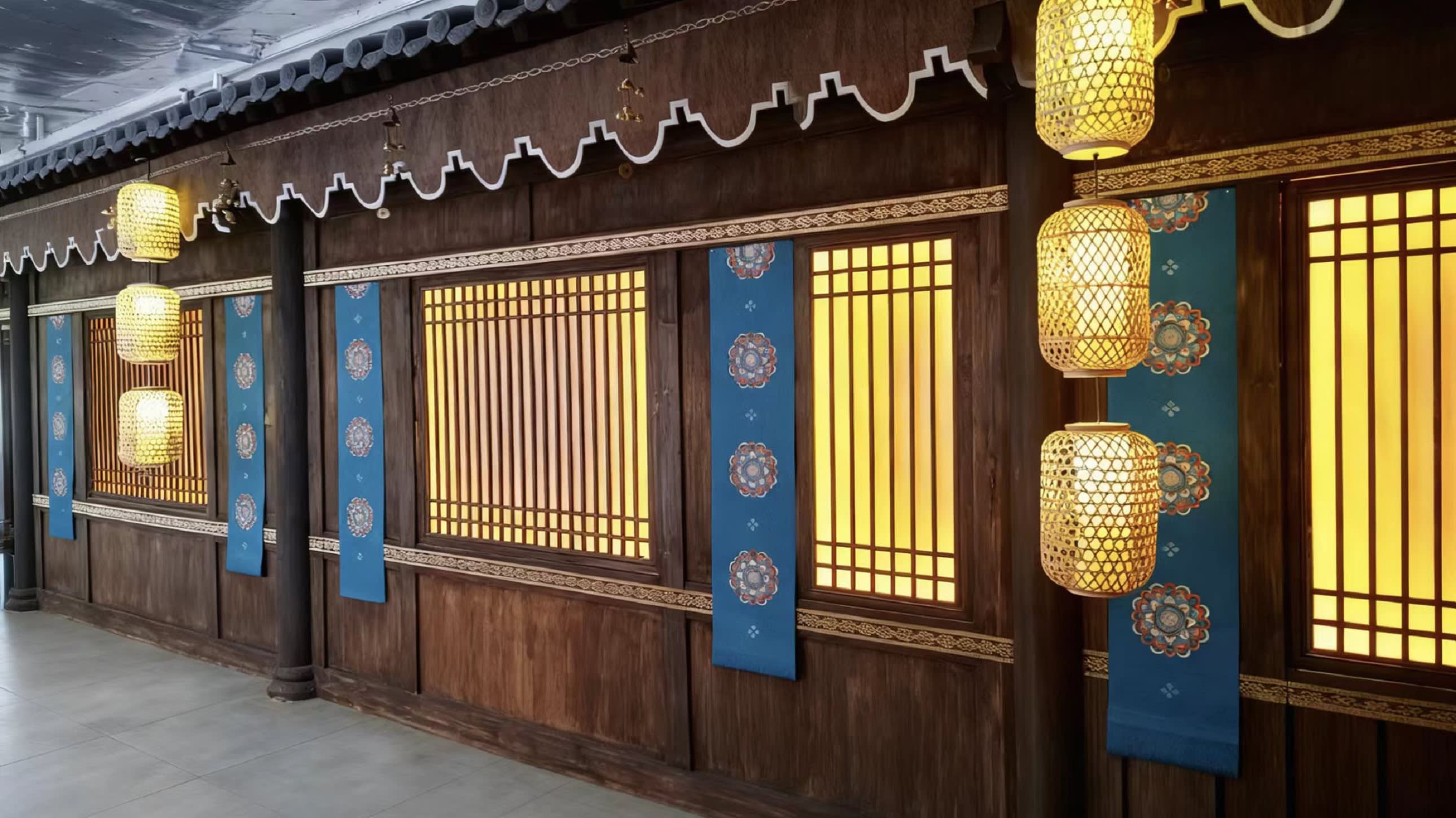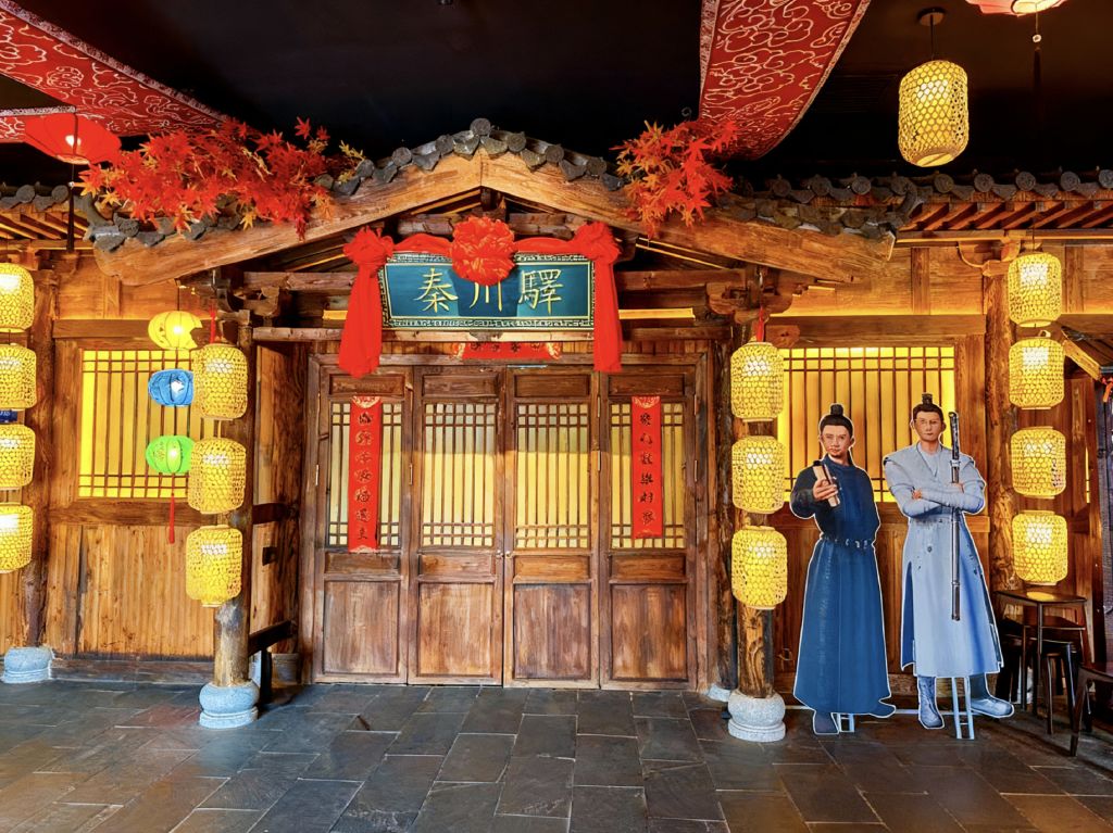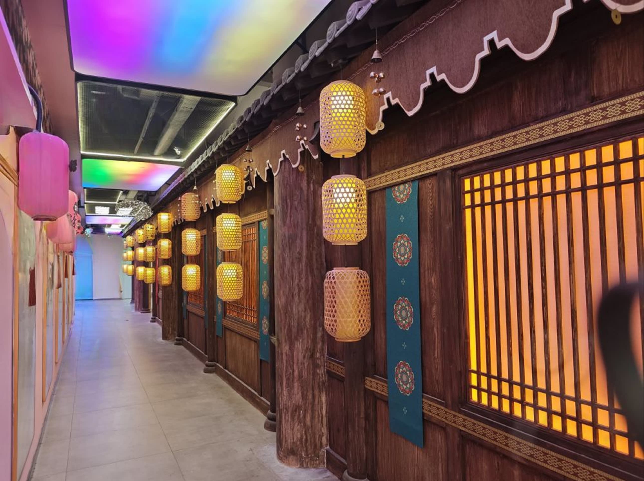 * 극장에 들어서면 주홍 궁궐 담벼락 아래 금빛 등불이 흔들리고, 서역 상점의 선반 위 유리 그릇이 이국적인 광택을 반사하며, 둔황 벽화 스타일의 문양이 벽면을 따라 흐르고, 호악 소리와 저잣거리 외침 소리가 귓가에 맴돌아 짙은 성당의 분위기가 순식간에 사람을 감쌉니다.
