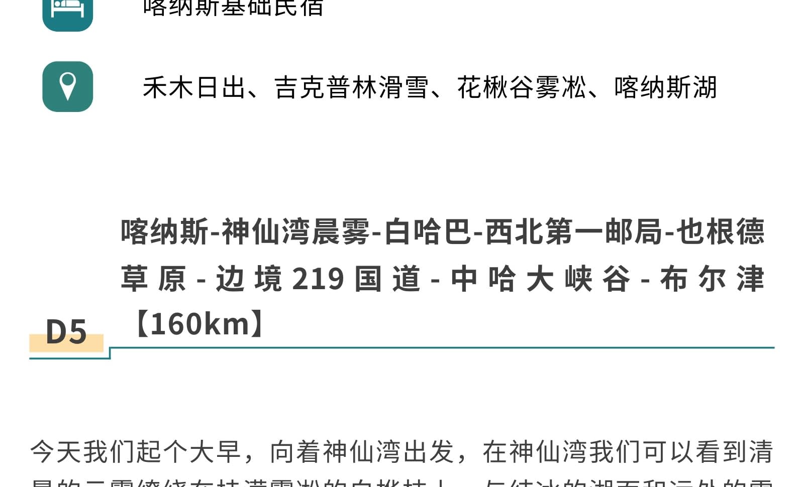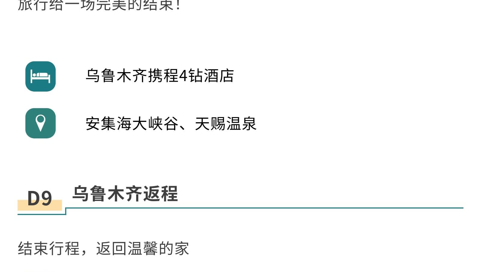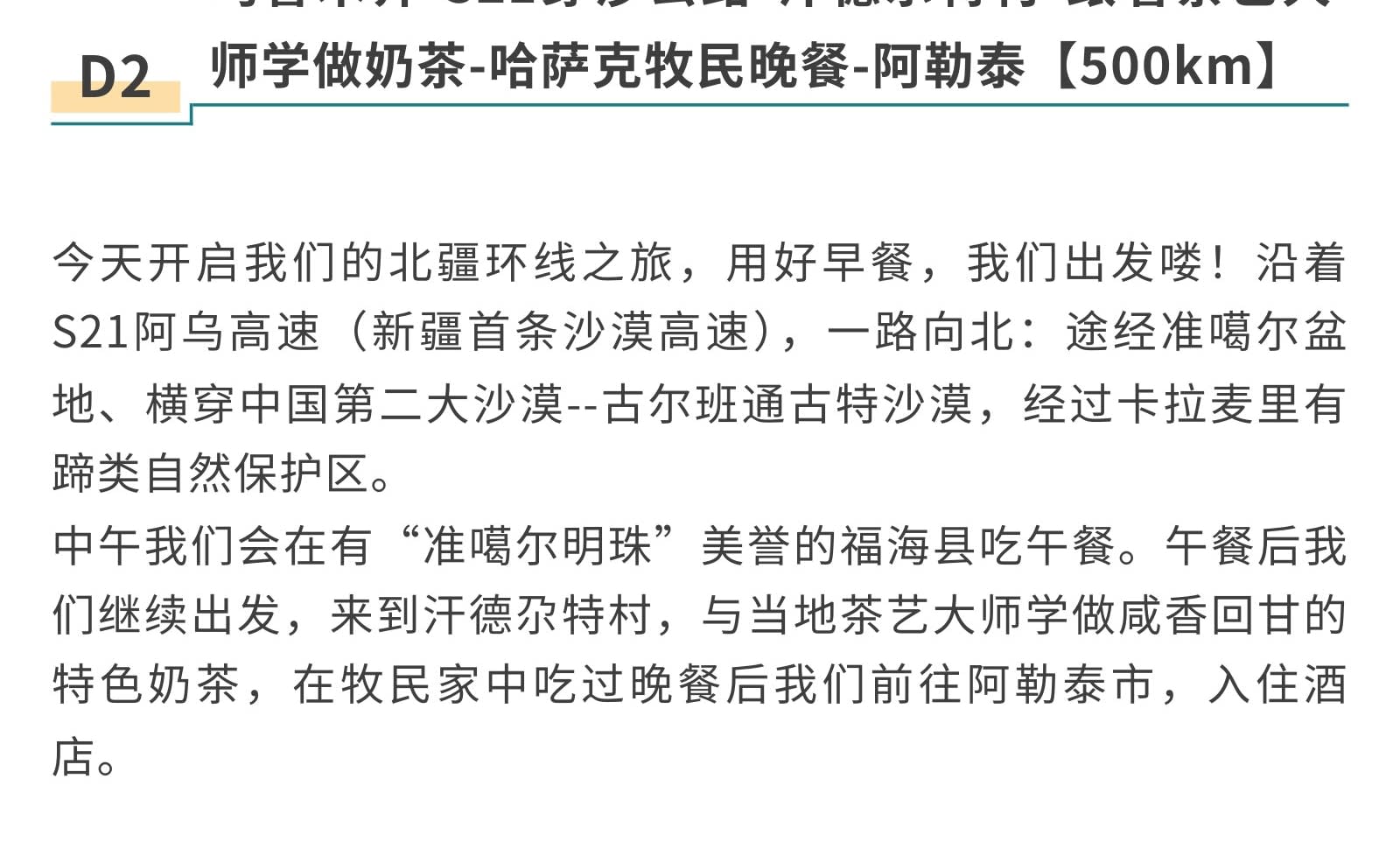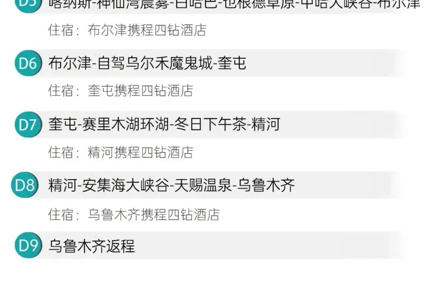 1일차: 우루무치 집합 2일차: 우루무치 출발 - S21 사막 횡단 도로 - 한데가트촌 - 다도 전문가에게 밀크티 제조법 배우기 - 카자흐족 유목민 저녁 식사 - 아르타이[550km] 3일차: 아르타이 출발 - 아허 도로 - 허무 여행 사진 촬영 - 허무 블루톤 일몰 - 밤에는 붕디 즐기기 - 허무[209km] 4일차: 허무 출발 - 지커푸린 스키 - 화추구 안개 서리 - 카나스호 - 카나스[100km] 5일차: 카나스 출발 - 신선만 아침 안개 - 바이하바 - 예근더 초원 - 국경 219번 국도 - 중하대협곡 - 부얼진[160km] 6일차: 부얼진 출발 - 자가용으로 우얼허 마귀성 탐험 - 쿠이툰[560km] 7일차: 쿠이툰 출발 - 사이리무호수 순환 - 겨울 오후 티타임 - 징허[500km] 8일차: 징허 출발 - 안지하이 대협곡 - 톈츠 온천 - 우루무치[450km] 9일차: 우루무치 출발하여 귀가