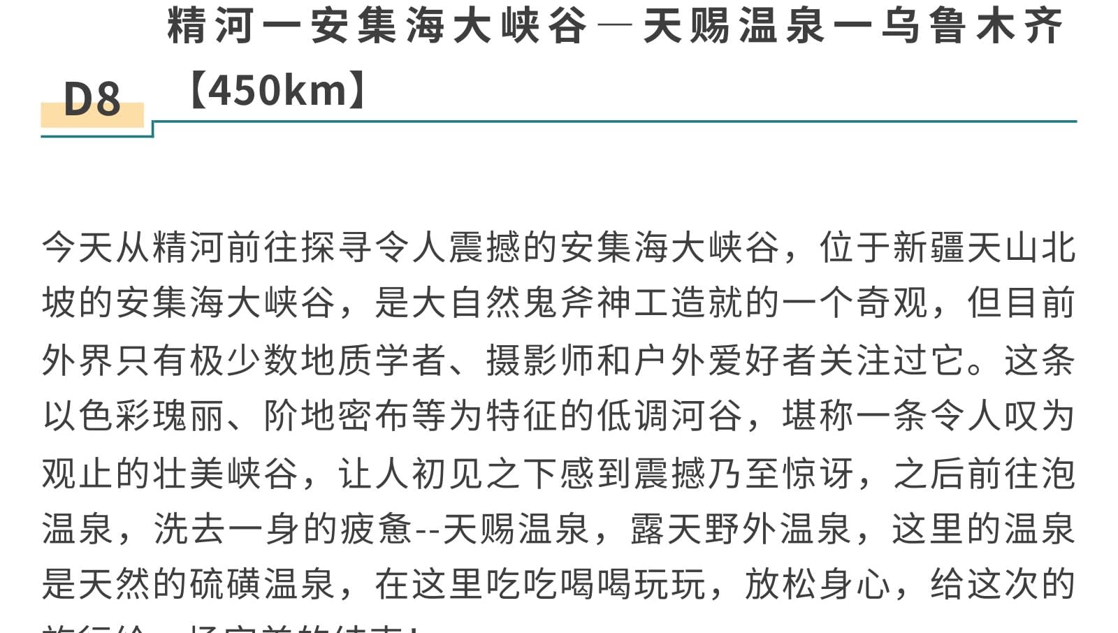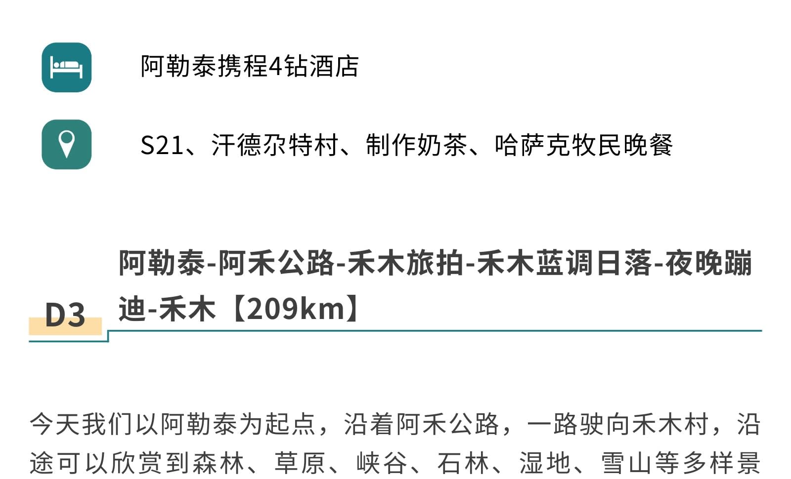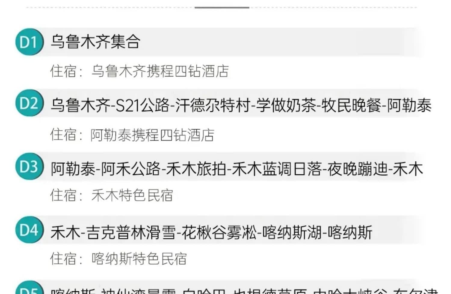 1일차: 우루무치 집합 2일차: 우루무치 출발 - S21 사막 횡단 도로 - 한데가트촌 - 다도 전문가에게 밀크티 제조법 배우기 - 카자흐족 유목민 저녁 식사 - 아르타이[550km] 3일차: 아르타이 출발 - 아허 도로 - 허무 여행 사진 촬영 - 허무 블루톤 일몰 - 밤에는 붕디 즐기기 - 허무[209km] 4일차: 허무 출발 - 지커푸린 스키 - 화추구 안개 서리 - 카나스호 - 카나스[100km] 5일차: 카나스 출발 - 신선만 아침 안개 - 바이하바 - 예근더 초원 - 국경 219번 국도 - 중하대협곡 - 부얼진[160km] 6일차: 부얼진 출발 - 자가용으로 우얼허 마귀성 탐험 - 쿠이툰[560km] 7일차: 쿠이툰 출발 - 사이리무호수 순환 - 겨울 오후 티타임 - 징허[500km] 8일차: 징허 출발 - 안지하이 대협곡 - 톈츠 온천 - 우루무치[450km] 9일차: 우루무치 출발하여 귀가