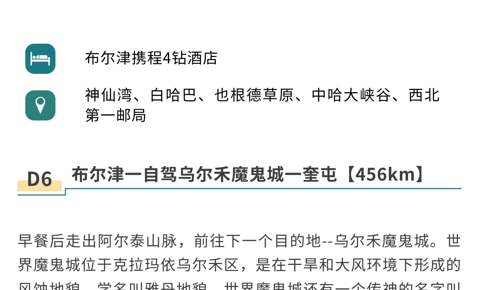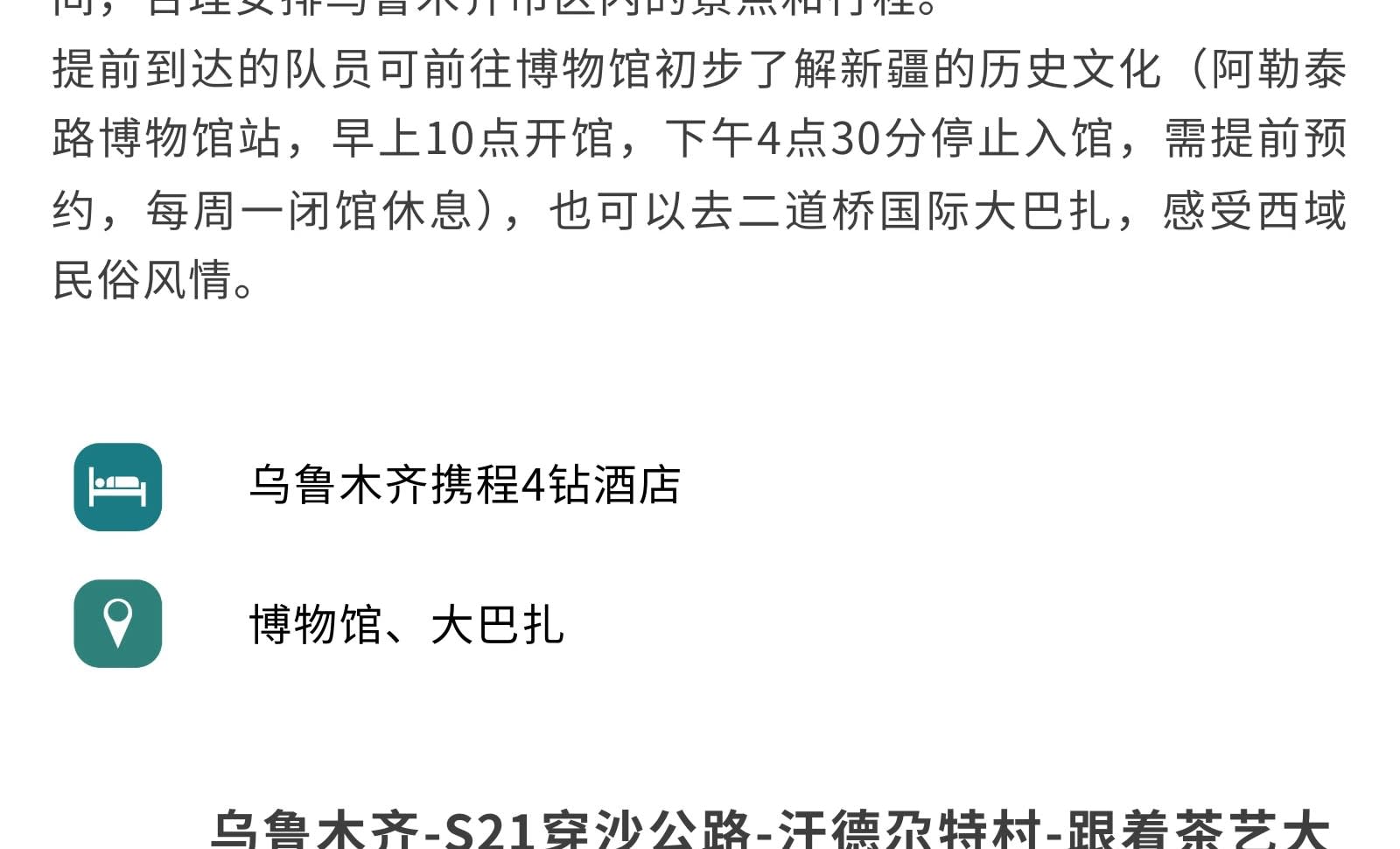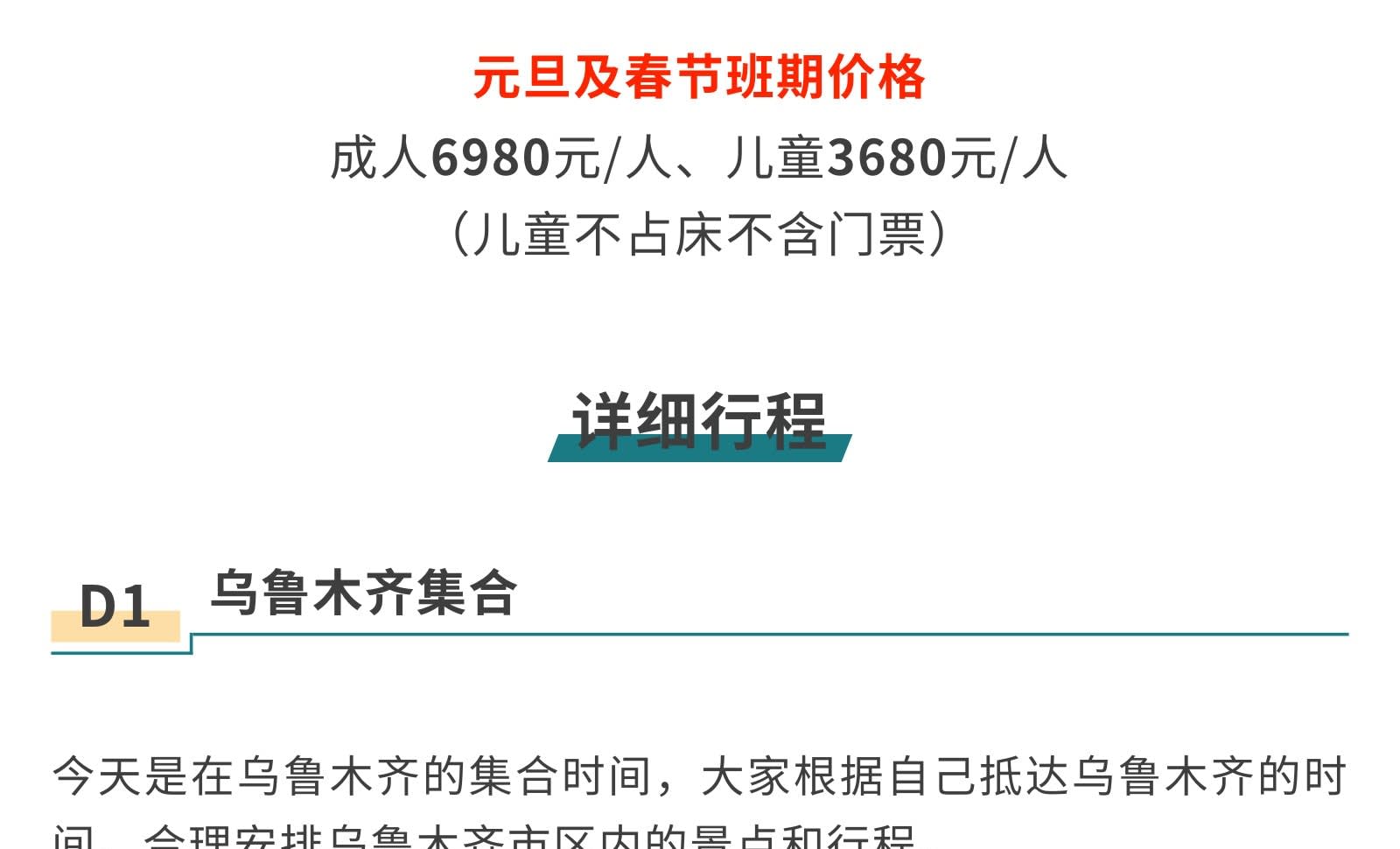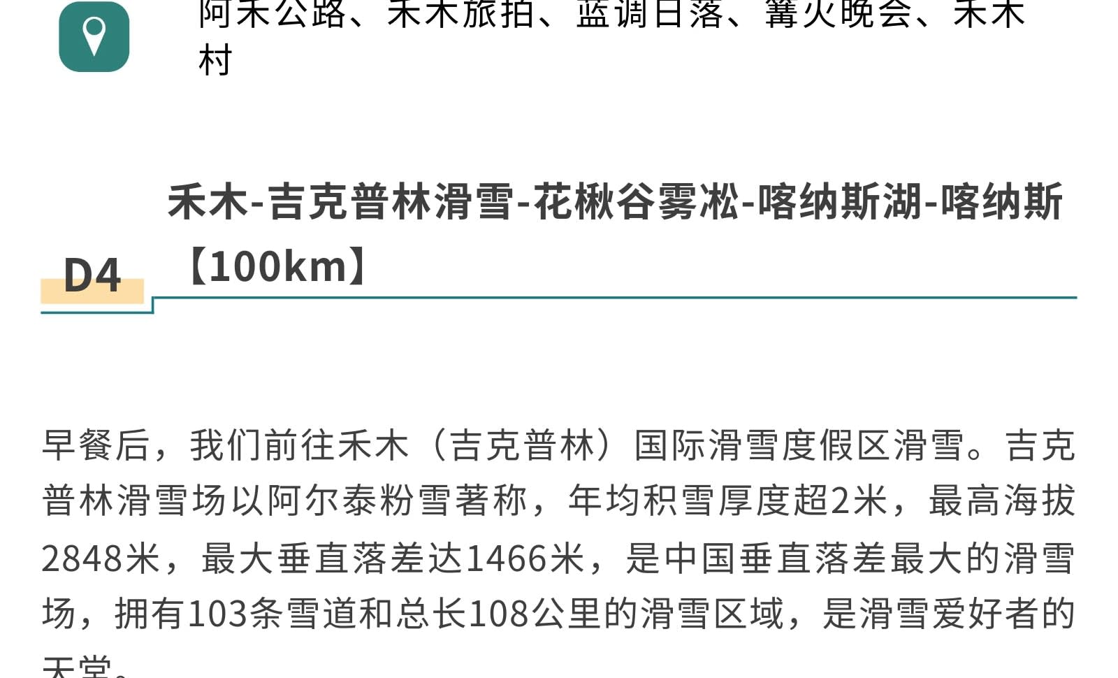 1일차: 우루무치 집합 2일차: 우루무치 출발 - S21 사막 횡단 도로 - 한데가트촌 - 다도 전문가에게 밀크티 제조법 배우기 - 카자흐족 유목민 저녁 식사 - 아르타이[550km] 3일차: 아르타이 출발 - 아허 도로 - 허무 여행 사진 촬영 - 허무 블루톤 일몰 - 밤에는 붕디 즐기기 - 허무[209km] 4일차: 허무 출발 - 지커푸린 스키 - 화추구 안개 서리 - 카나스호 - 카나스[100km] 5일차: 카나스 출발 - 신선만 아침 안개 - 바이하바 - 예근더 초원 - 국경 219번 국도 - 중하대협곡 - 부얼진[160km] 6일차: 부얼진 출발 - 자가용으로 우얼허 마귀성 탐험 - 쿠이툰[560km] 7일차: 쿠이툰 출발 - 사이리무호수 순환 - 겨울 오후 티타임 - 징허[500km] 8일차: 징허 출발 - 안지하이 대협곡 - 톈츠 온천 - 우루무치[450km] 9일차: 우루무치 출발하여 귀가