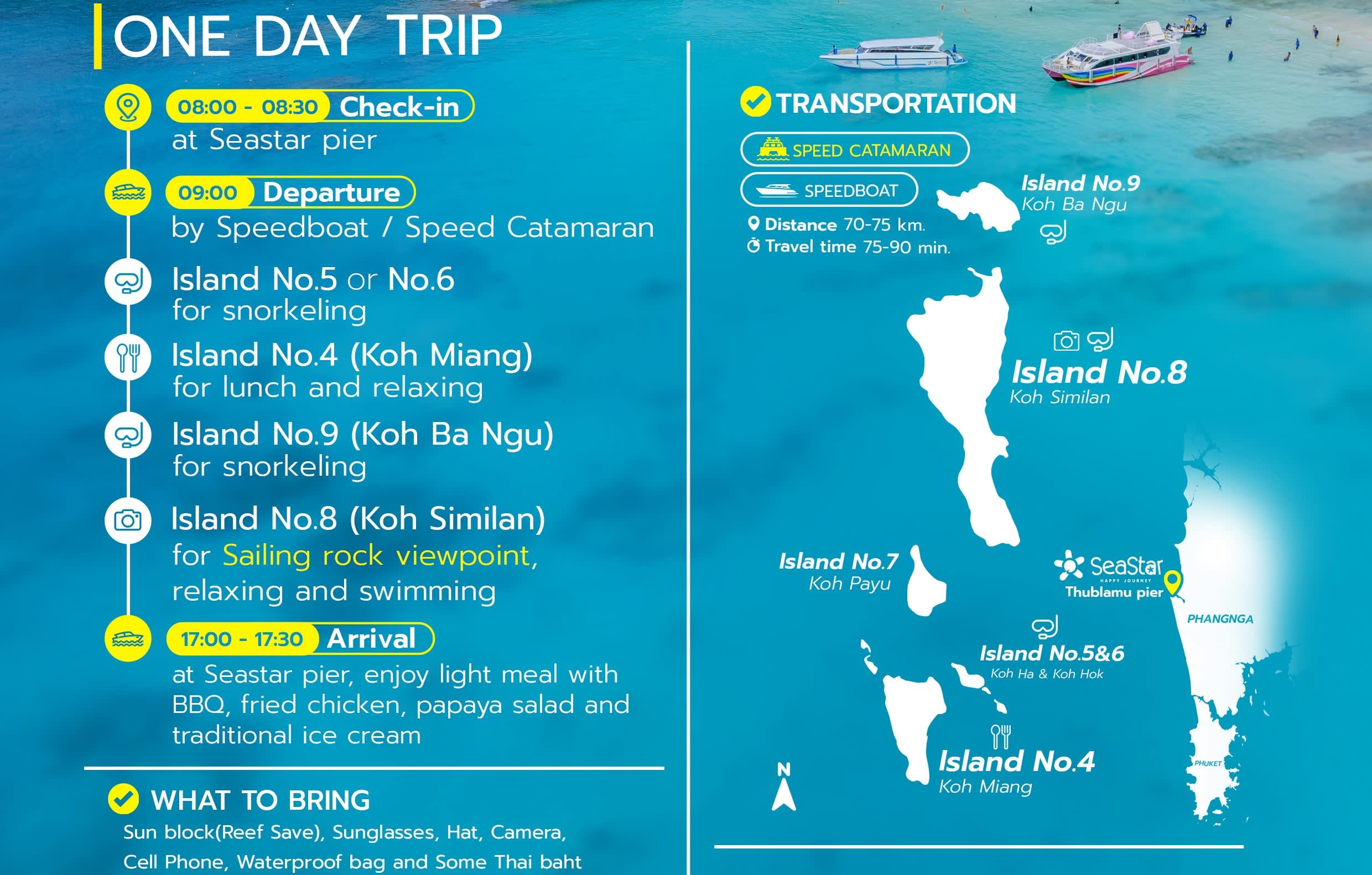 • 시밀란 제도의 섬들을 방문하며 스노클링, 자유시간 해변 휴식, 전망 감상 등을 하루에 즐겨보세요. 🌊