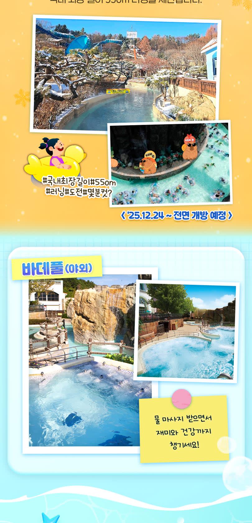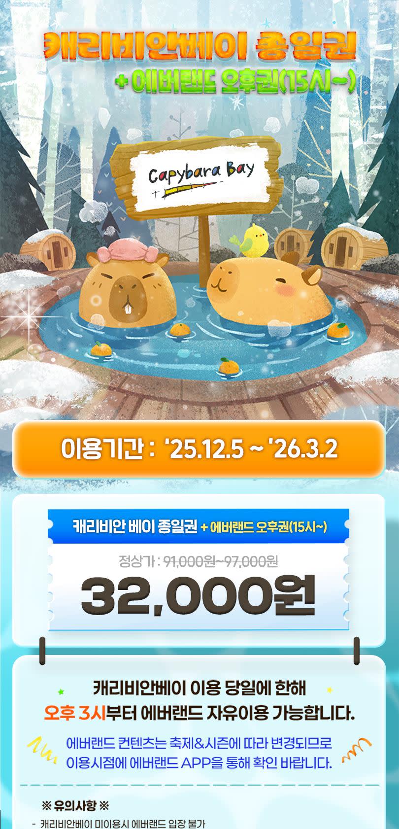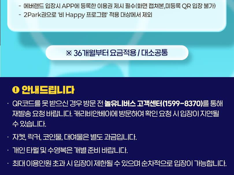 [이용 정보] * 판매기간 : ~ 2026.03.02 * 유효기간 : 2025.12.05 ~ 2026.03.02 [사용 방법] * ★~12/17 기간까지 매주 화/수요일은 휴장이니 이용에 참고 바랍니다. * ★캐리비안베이 이용 당일에 한해 오후 3시부터 에버랜드 자유이용 가능합니다. * 에버랜드 입장시 APP에 등록한 이용권 제시 필수(화면 캡쳐본, APP 미등록 QR 입장 불가) * ※ 에버랜드 컨텐츠는 축제&시즌에 따라 변경되므로 이용시점에 에버랜드 APP에서 확인 바랍니다 * 대/소 공통 이용 가능하며 36개월부터 요금 적용됩니다. * 자켓, 락커 ,코인물, 대여물 등은 별도 요금이 부과됩니다. * 개인 타월 및 수영복은 개별 준비 바랍니다. * 워터파크 특성상 안전을 위하여 제한물품(음식물,돗자리 등) 검사를 할 수 있으니 입장 전 보관소에 맡겨 주시기 바랍니다. * 최대이용인원 초과시 입장이 제한될 수 있으며 순차적으로 입장이 가능합니다. * 정문주차장/4주차장은 유료, 외곽주차장은 무료로 운영됩니다. * QR코드의 사진을 판매사이트에 그대로 올리는 경우 제3자의 무단 도용에 따른 피해가 발생할 수 있습니다. * 방문 전 캐리비안베이 홈페이지 또는 앱을 참고하세요. * ▷APP 내 이용권 등록하러가기 : https://grp.everland.com/mobile/etc/mobileapp/mobileapp_download.html * ▷캐리비안 베이: https://www.everland.com/caribbeanbay/home/main * 1.상품구매 * 2.문자로 QR 코드수신 * 3.MMS 상단에 보여지는 QR코드를 에버랜드 App에 등록 후 캐리비안베이 정문에서 제시 후 입장 * ※QR코드는 구매 후 못받으신 경우 방문전 놀유니버스 고객센터(1599-8370)를 통해 재발송 요청 바랍니다. * 캐리비안베이 방문하여 확인 요청시 입장이 지연될 수 있습니다. - (응대 가능시간:~18시)