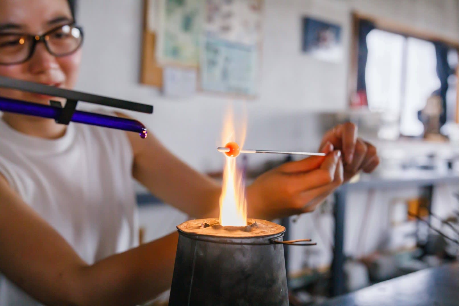* 불꽃 위에서 유리 막대를 녹여 자신만의 독창적인 유리 구슬을 만들어 보세요.