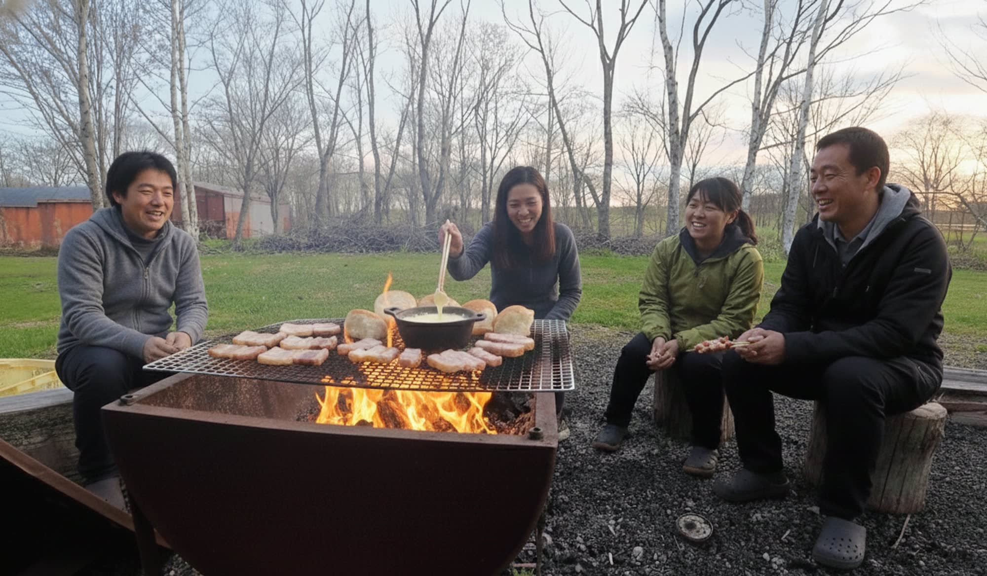 * 초점: 자연 속에서 휴식, 분위기, 모닥불과 음식을 즐기는 것.