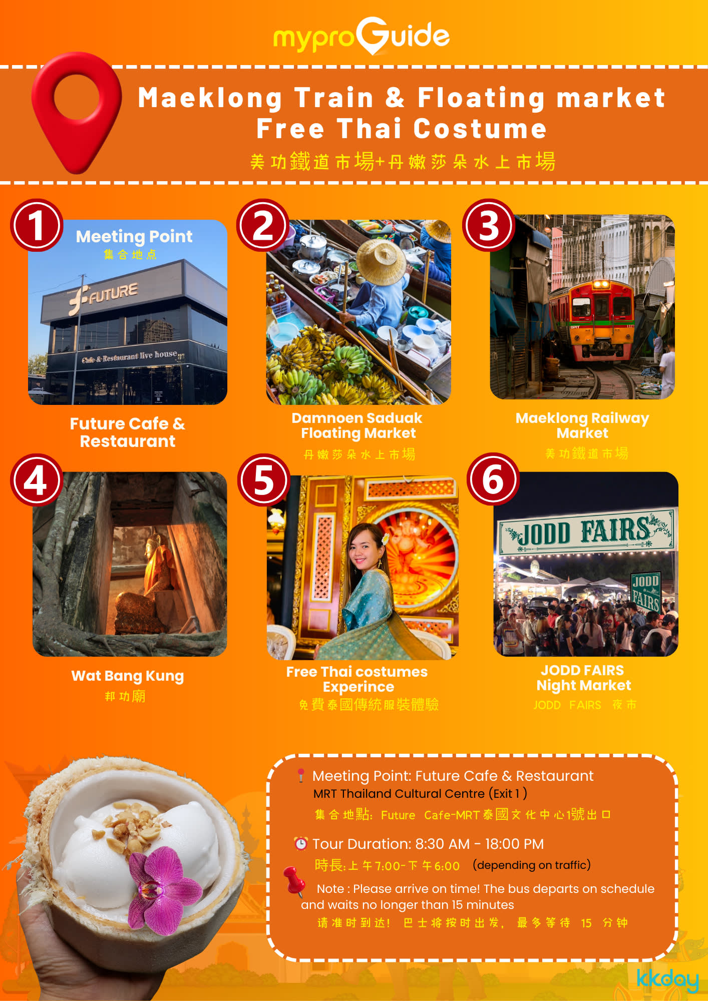 ✔ 나무 속 신성한 불상 – 신비로운 숨겨진 보물 ✔ 수상 시장 보트 탑승 – 활기찬 보트에서 쇼핑하고 간식 즐기기 ✔ 기차 시장의 마법 – 기차가 지나갈 때 가판대가 사라지는 것을 구경하세요! ✔ 음료/음식 구매 시 무료 태국 전통 의상 체험 (오전 8시 30분 경로) – 옷을 입고 사진을 찍으세요 ✔ 조드 페어 야시장 하차 – 방콕 최고의 길거리 음식과 쇼핑을 즐겨보세요