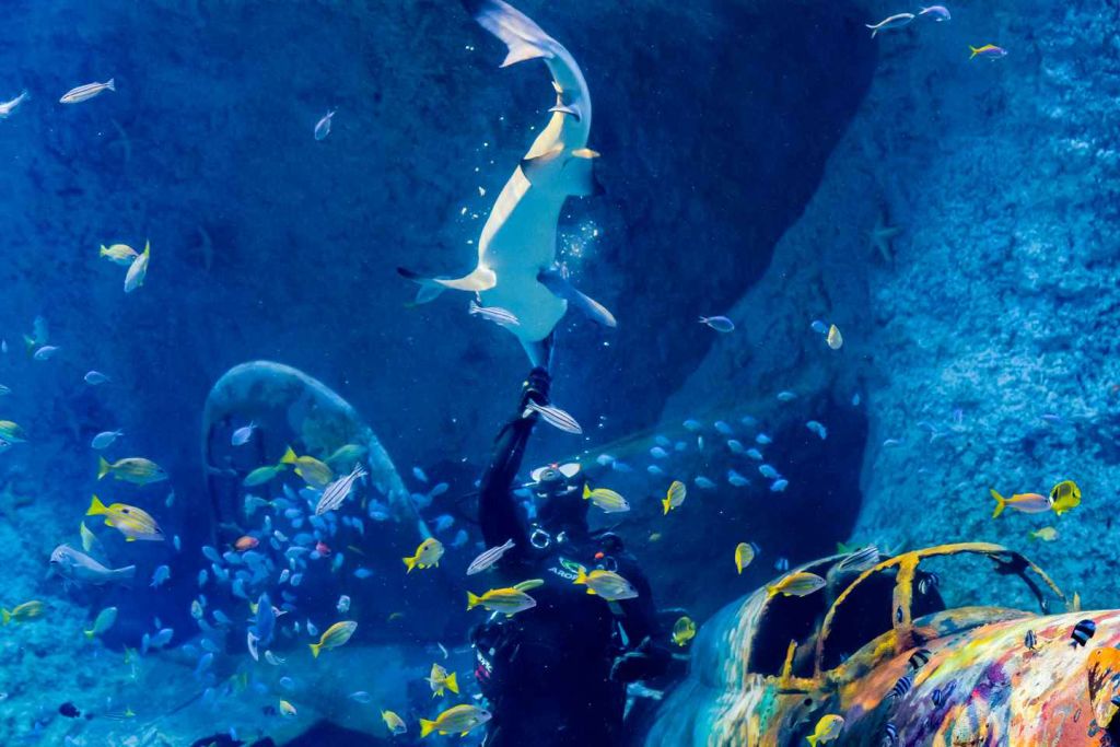 10개의 독특한 구역에서 무시무시한 상어, 장엄한 가오리, 다채로운 열대어를 만나보세요.