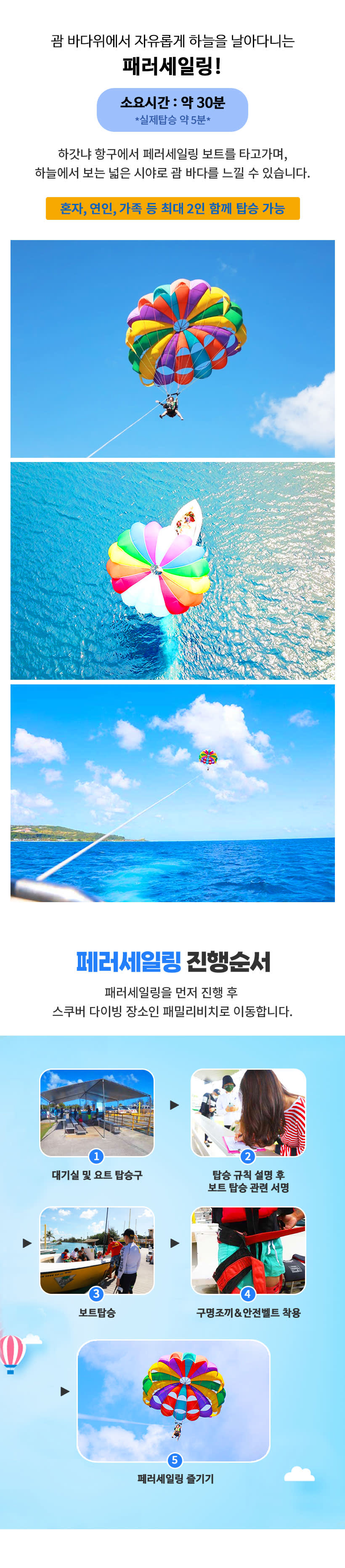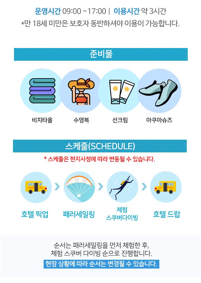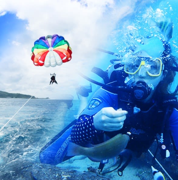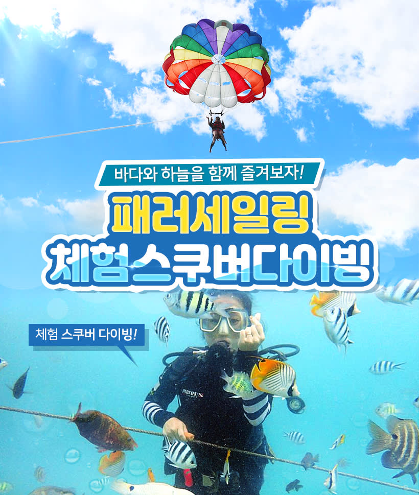 패러세일링과 체험스쿠버 다이빙이 포함된 상품이며, 패밀리비치 액티비티로 자유롭게 이용하실 수 있습니다.하늘과 바다에서 제대로 즐겨보세요!