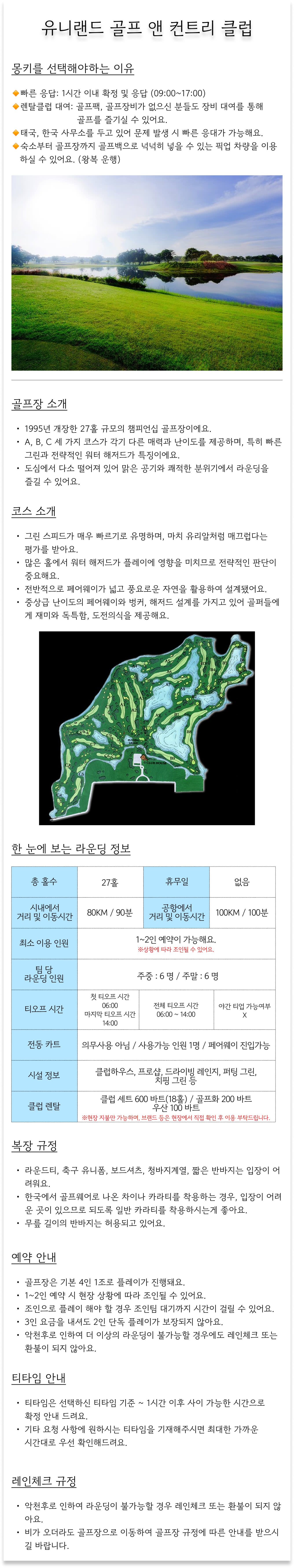 🚗 차량 정보 - 승용차 : 1~3인, 골프백 3개 또는 골프백 2개 + 20인치 캐리어 2개 - 밴 : 1~9인, 골프백 8개 또는 골프백 6개 + 20인치 캐리어 6개 💲 캐디팁 - 태국의 골프장은 캐디피와 별도로 캐디팁을 반드시 지불해야해요. - 캐디팁은 골프장에 따라 조금씩 다르나, 18홀 당 500바트 이상의 캐디팁을 권장해요. - 캐디팁은 라운딩 종료 후 캐디에게 직접 지불해주시면 돼요. ❗ 기타 - 부득이하게 추가 금액이 발생 되는 경우, 예약 진행 시 사전 안내 드립니다. - 개별 여행자 보험 가입을 권장 드려요. - 토, 일요일 및 태국 공휴일에는 주말 요금이 적용돼요. - 현금 및 귀중품 분실과 개인 안전 사고에 유의해주세요. - 외부에서 구입한 음료 및 음식물은 필드로 반입이 불가능해요. 라운딩 전 적발 시 : 음식 및 음료 제외한 후 라운딩 시작 혹은 심한 경우에는 티오프 불가 (환불 불가) 라운딩 중 적발 시 : 라운딩 진행 불가 및 퇴장 조치 (환불 불가)